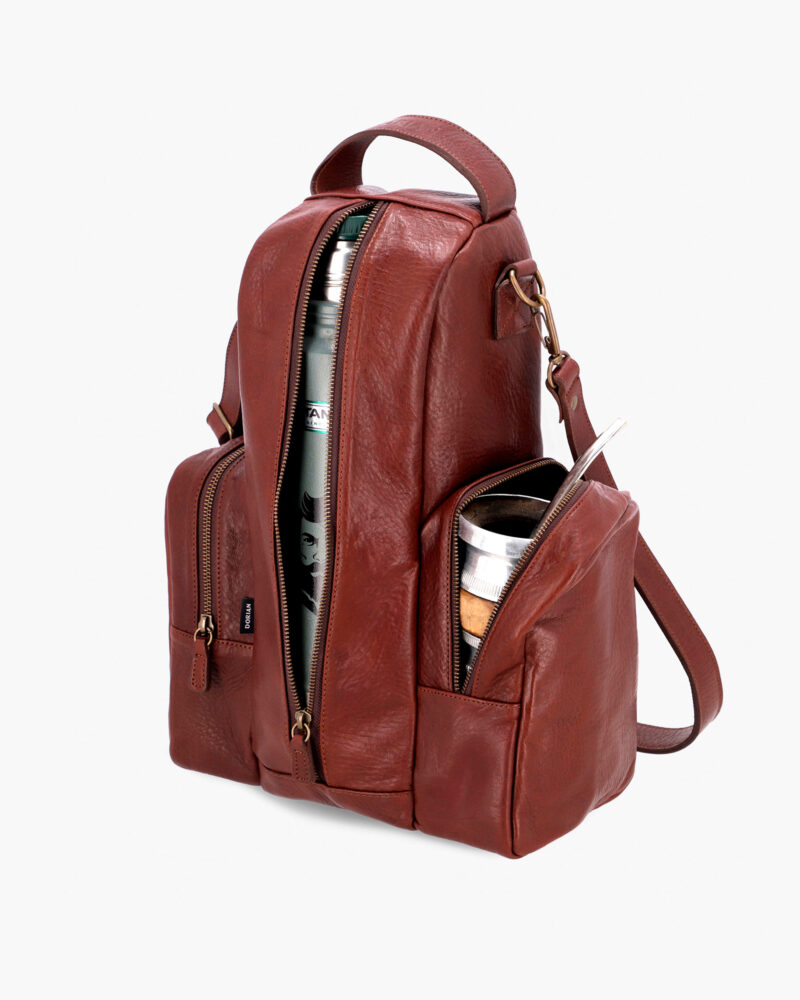Elegant and practical, made of cowhide leather with antique brass zippers. Ideal for carrying your mate gourd everywhere. It has a compartment for a thermos, with a leather strap and Velcro closure to keep it securely in place.