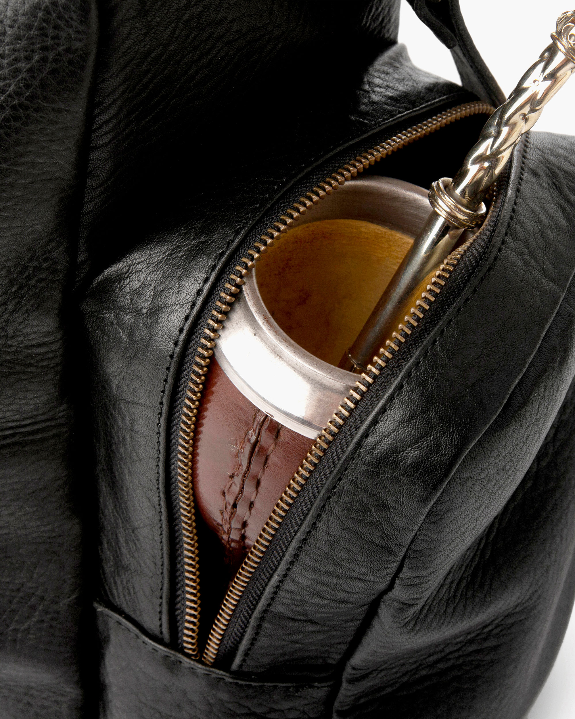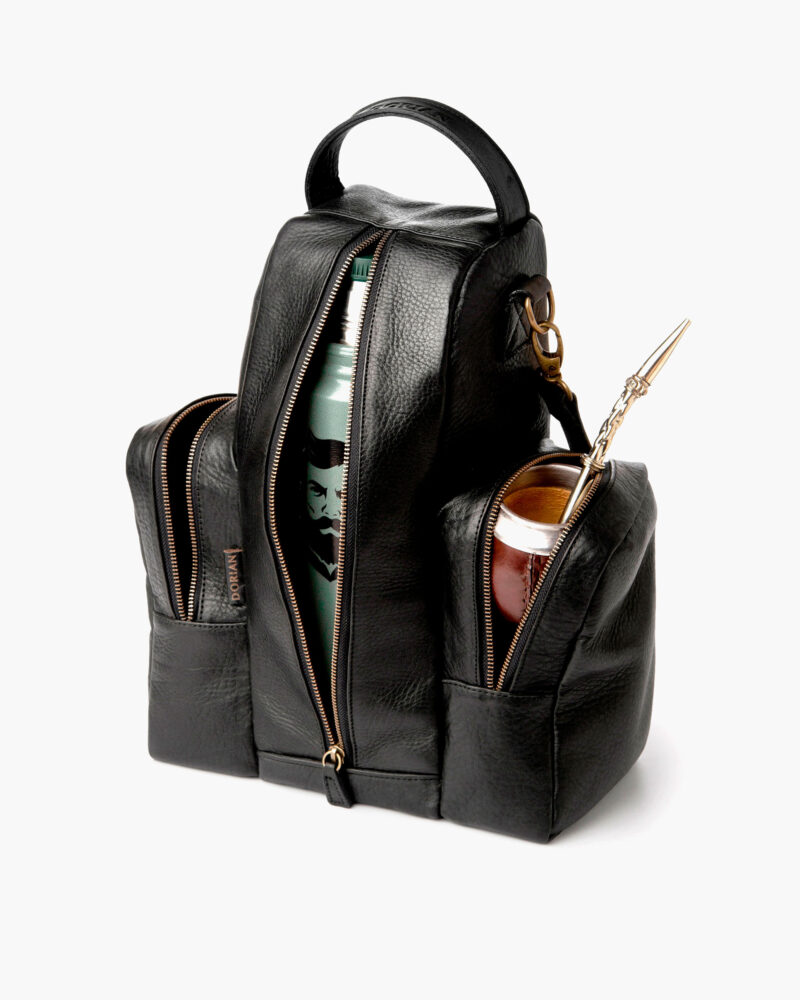 Elegant and practical, made of cowhide leather with antique brass zippers. Ideal for carrying your mate gourd everywhere. It has a compartment for a thermos, with a leather strap and Velcro closure to keep it securely in place.