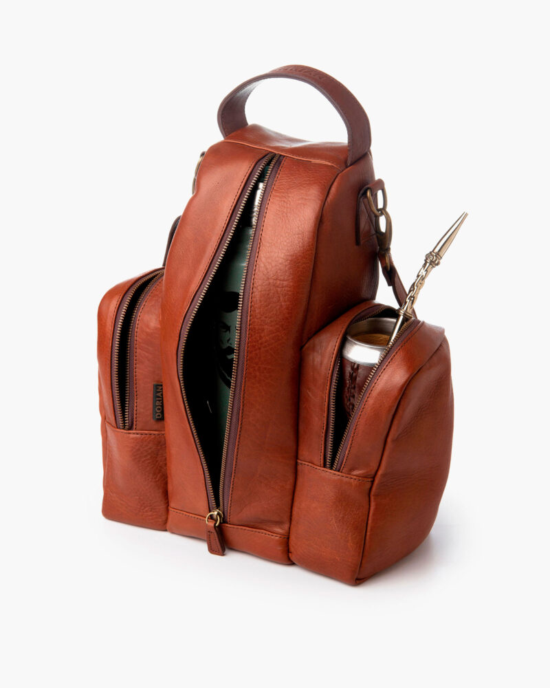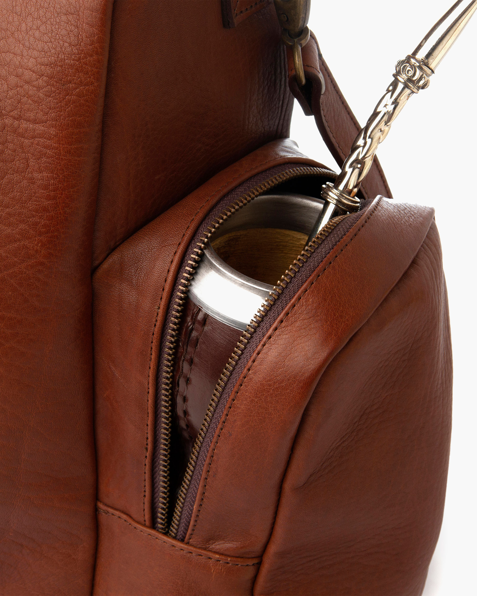 Elegant and practical, made of cowhide leather with antique brass zippers. Ideal for carrying your mate gourd everywhere. It has a compartment for a thermos, with a leather strap and Velcro closure to keep it securely in place.