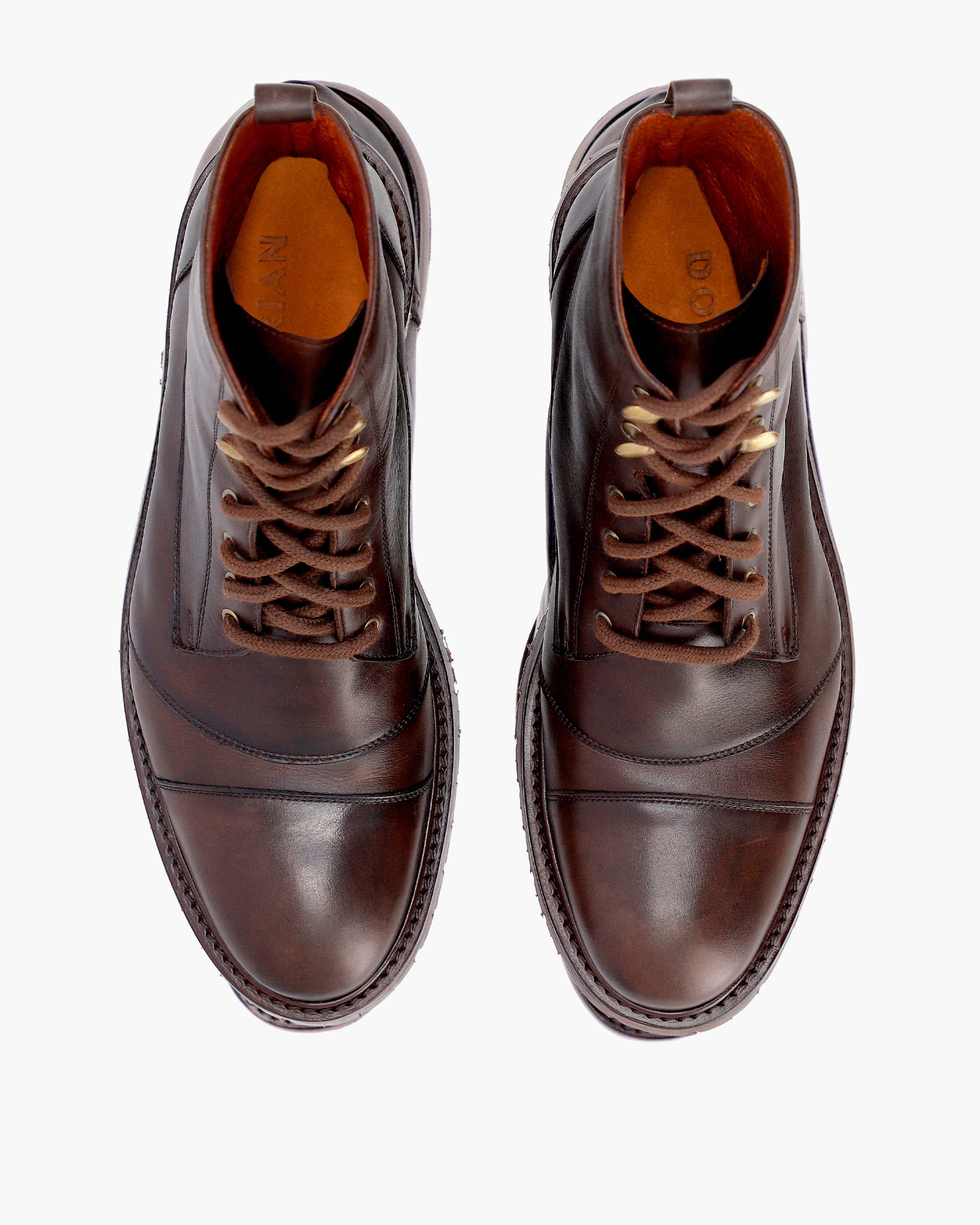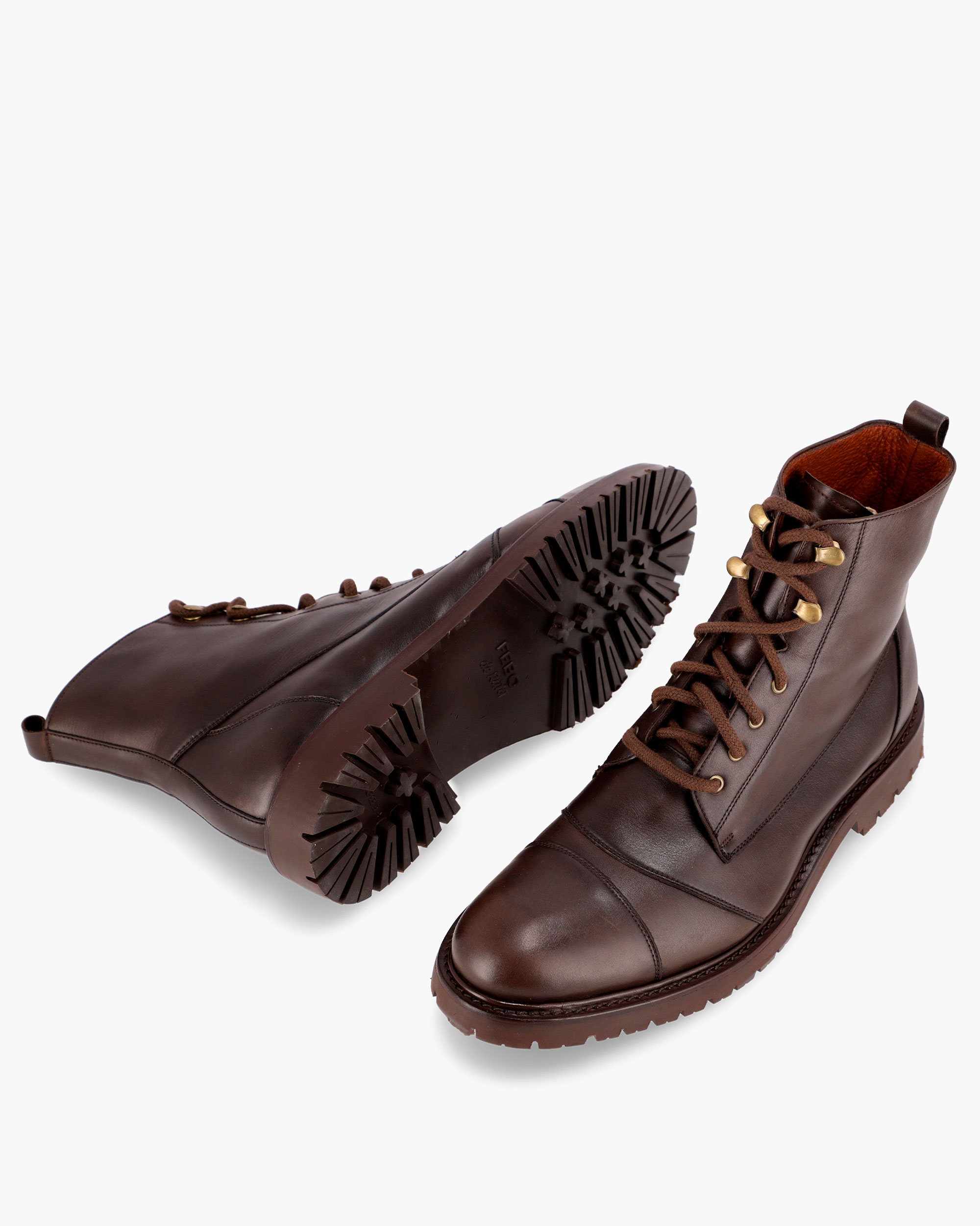 High-top leather boots, handcrafted. The upper is made of vegetable-tanned cowhide and the interior is lined with cowhide. The sole is made of Ruta Febo rubber, with an EVA rubber midsole.