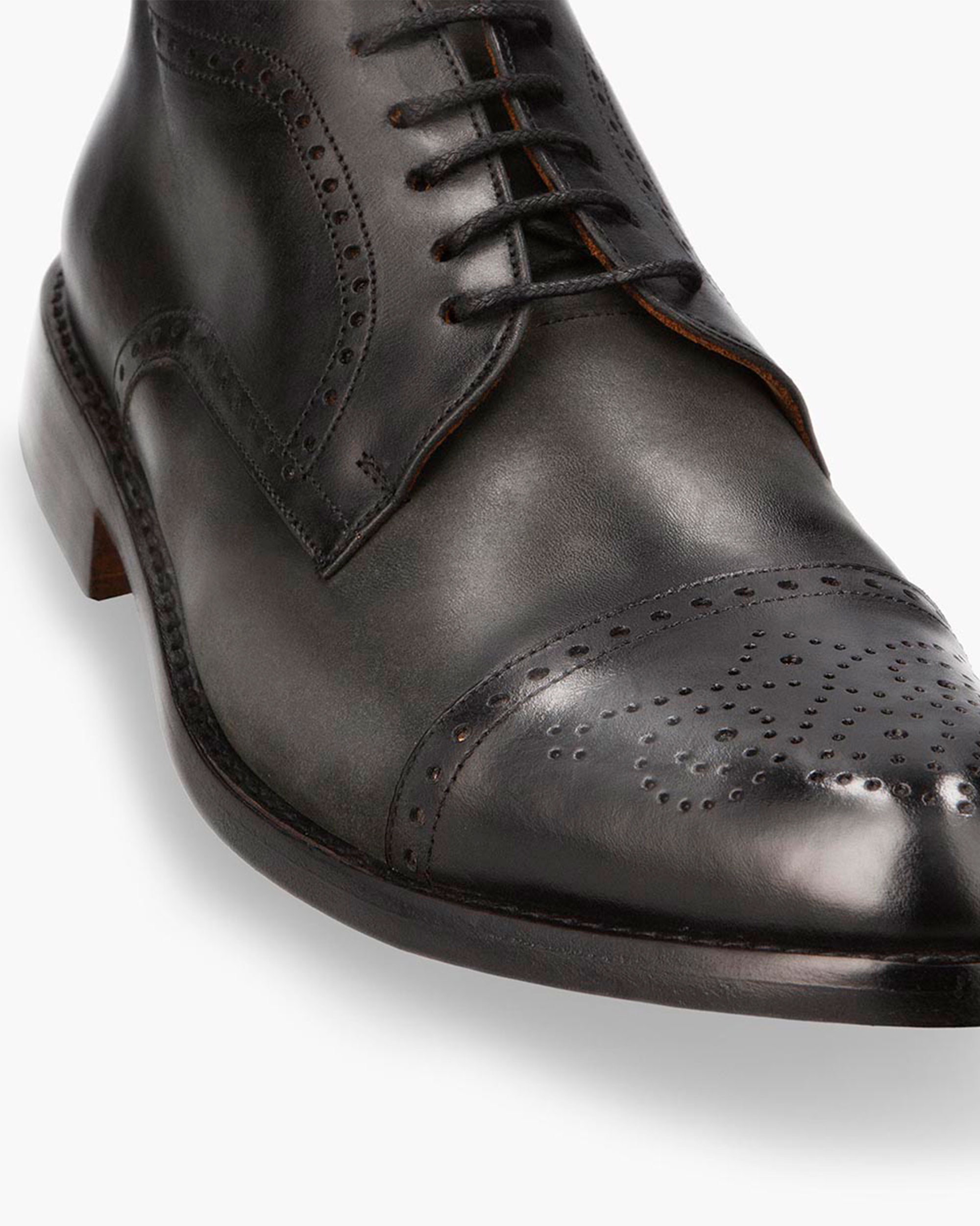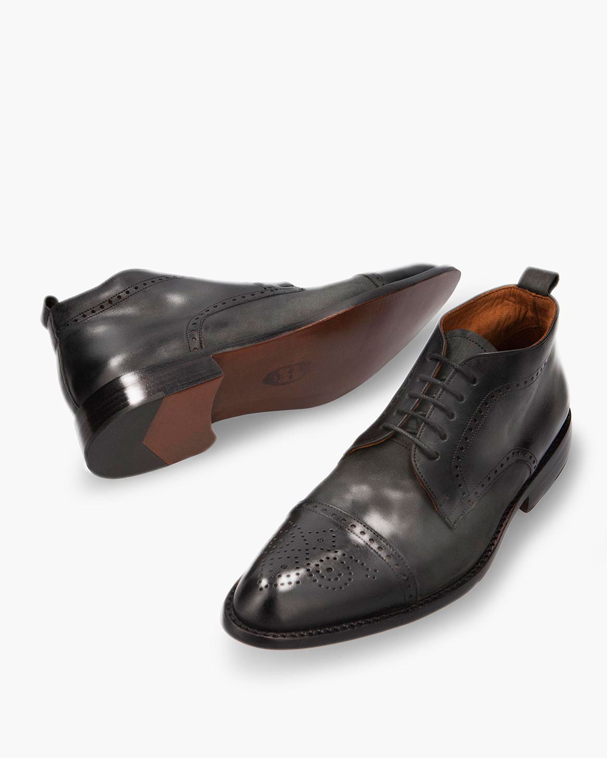 Handcrafted dress boot. The upper is made of aniline-dyed cowhide and the interior is lined in leather. The heel is 3 cm high and the laces are made of waxed cotton. Both the sole and the heel protector are made of natural leather.