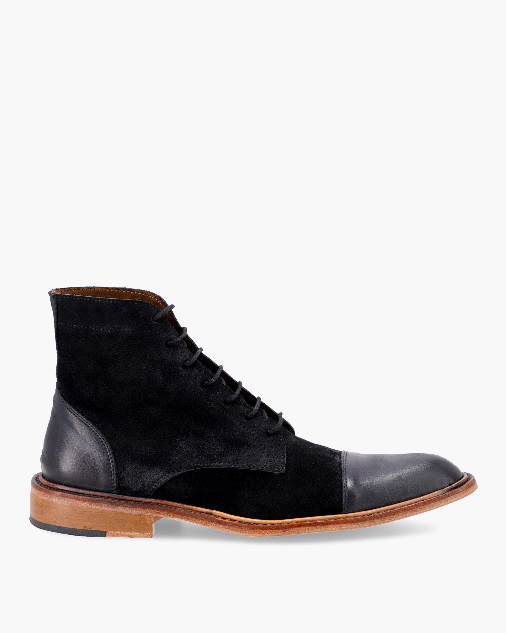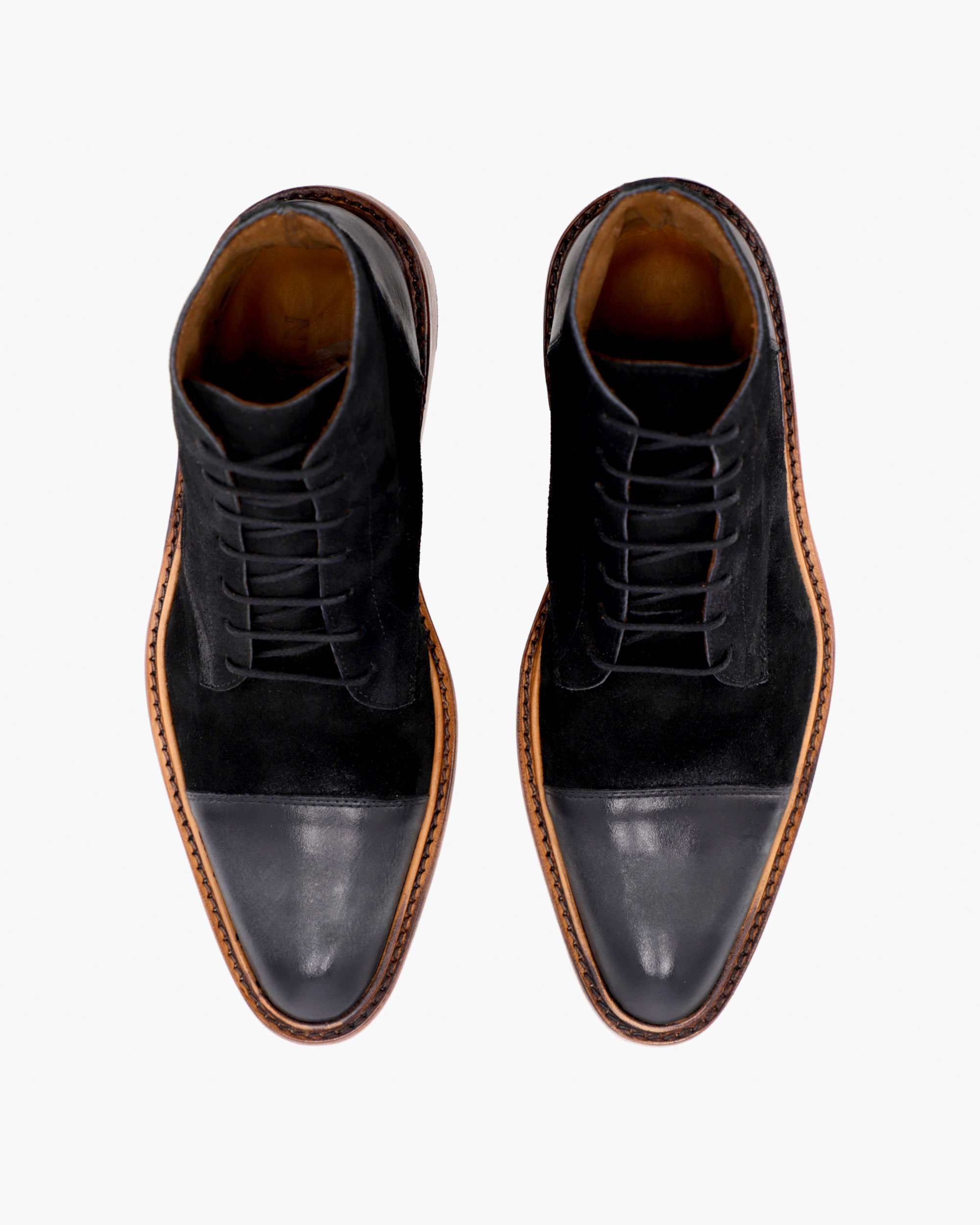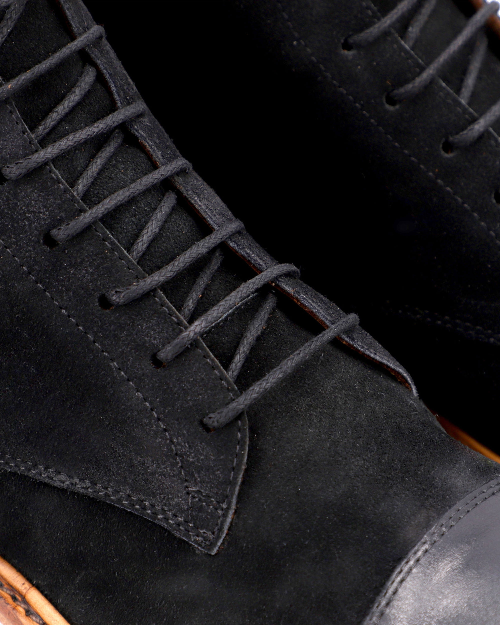 High-shaft dress boots, handcrafted from 100% genuine leather. Features a two-tone leather combination, leather sole, and waxed cotton laces.