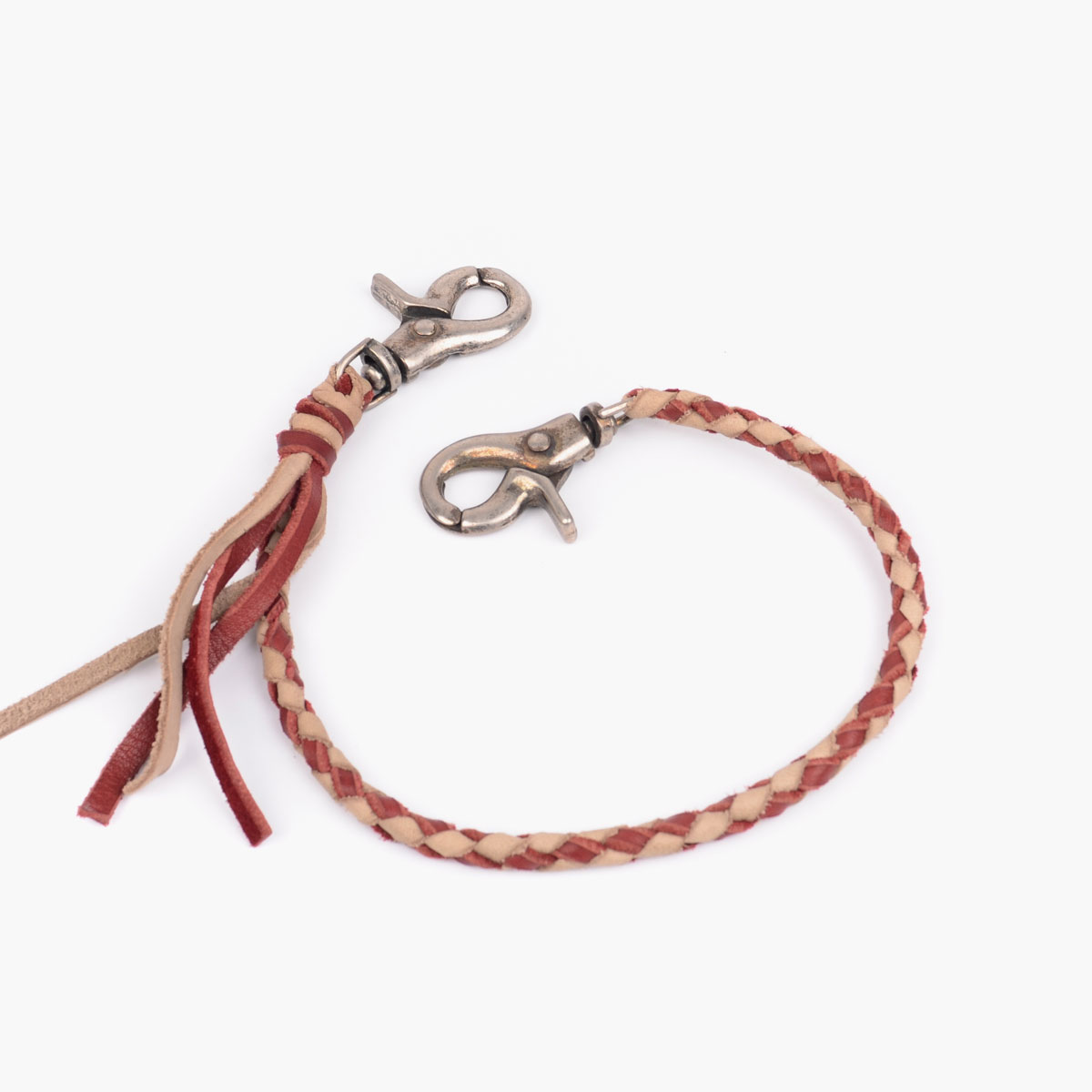 Braided cowhide leather chains. Antique bronze-colored carabiners.