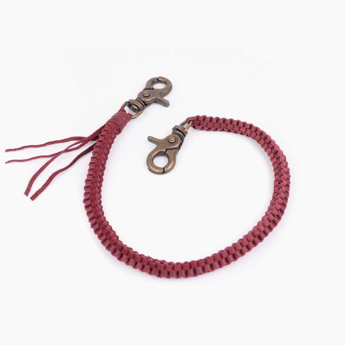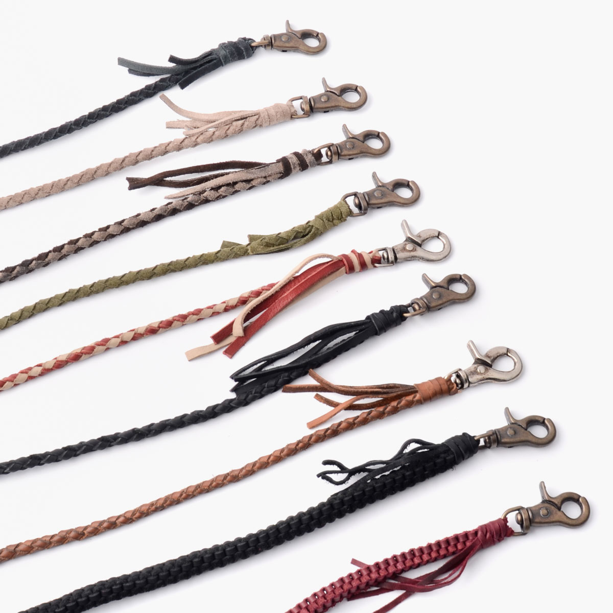 Braided cowhide leather chains. Antique bronze-colored carabiners.