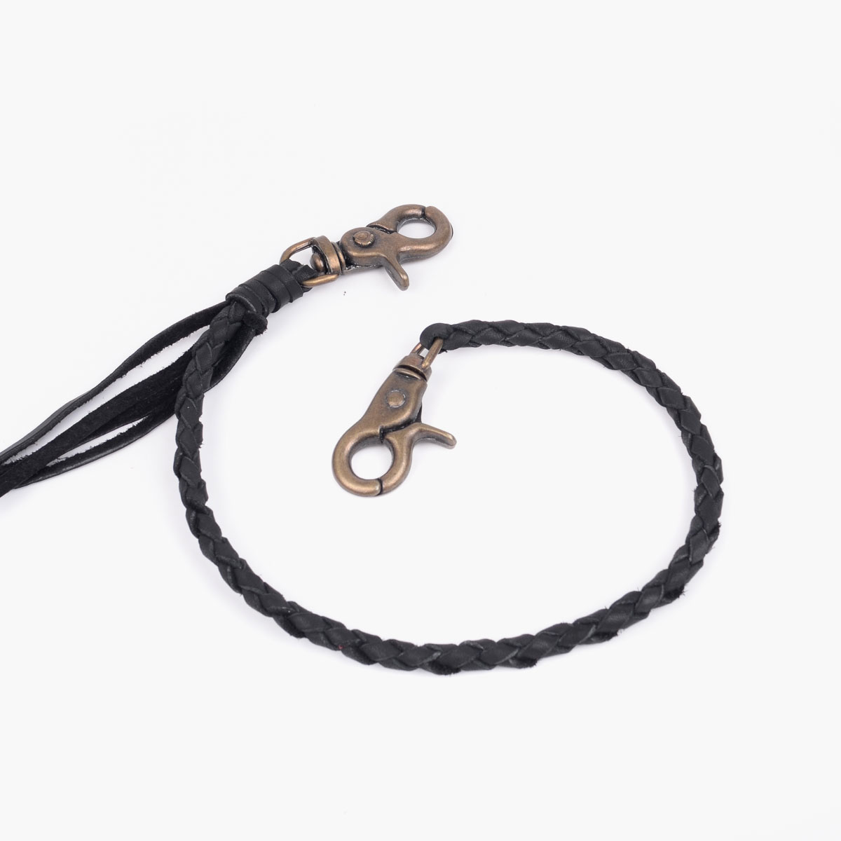 Braided cowhide leather chains. Antique bronze-colored carabiners.