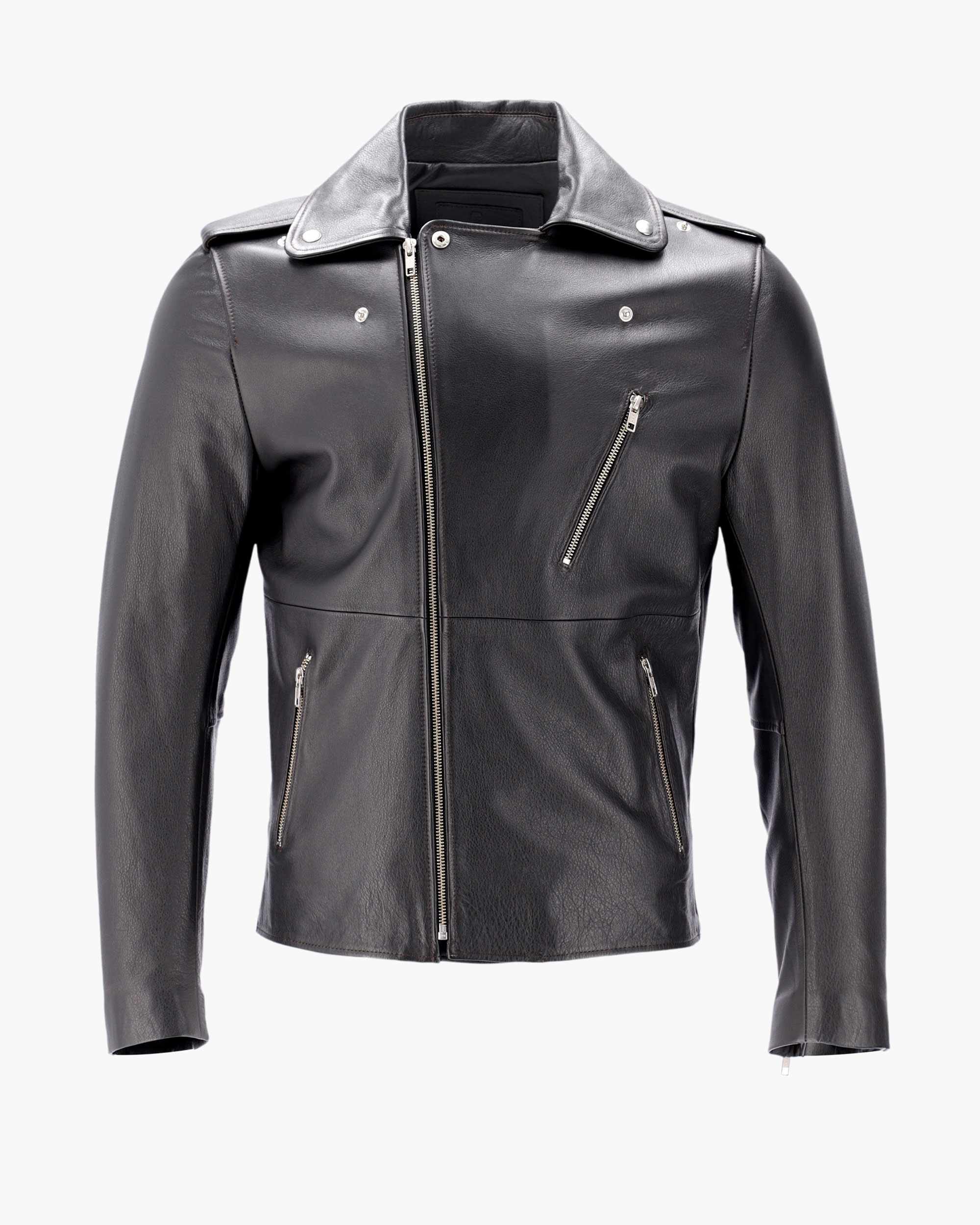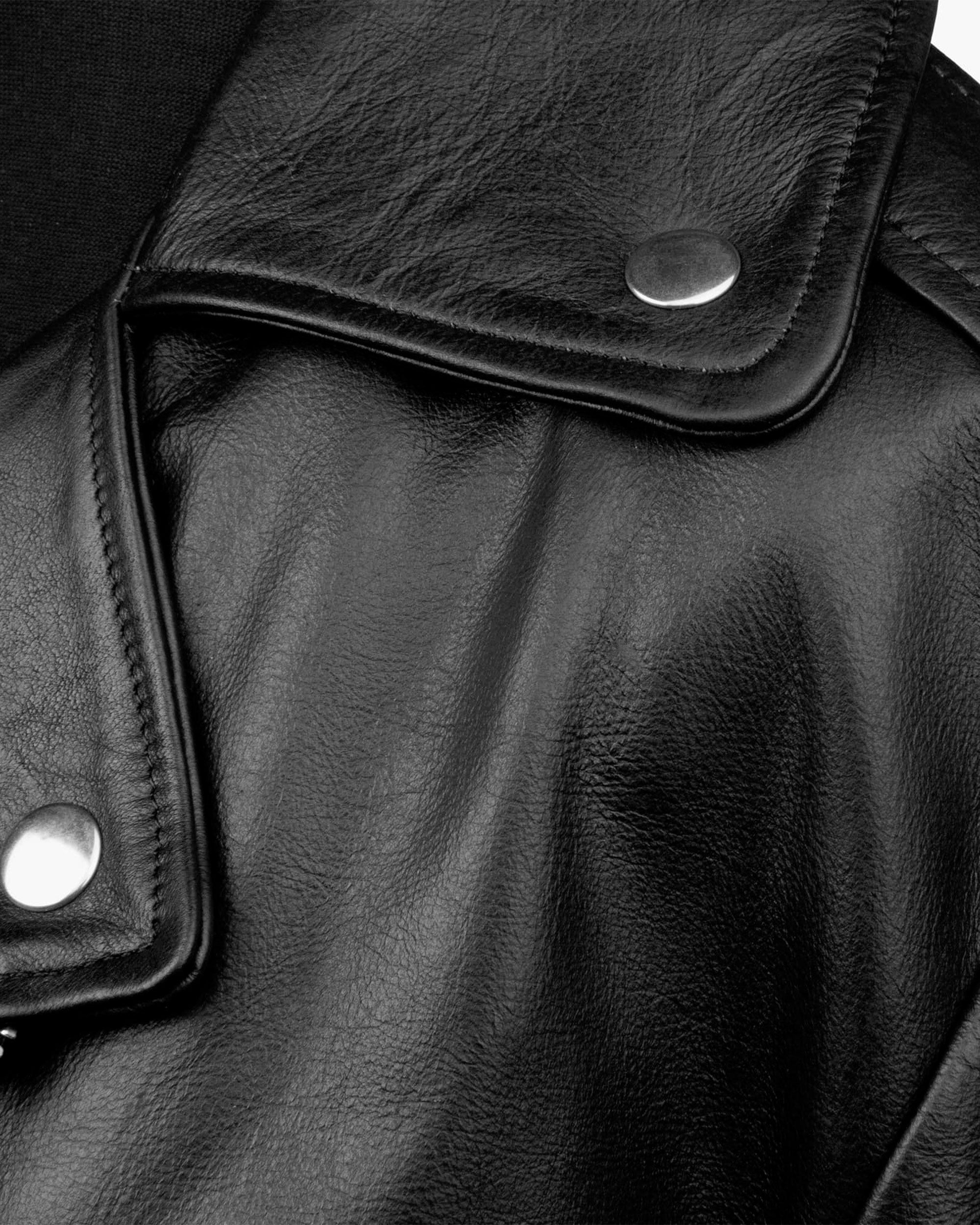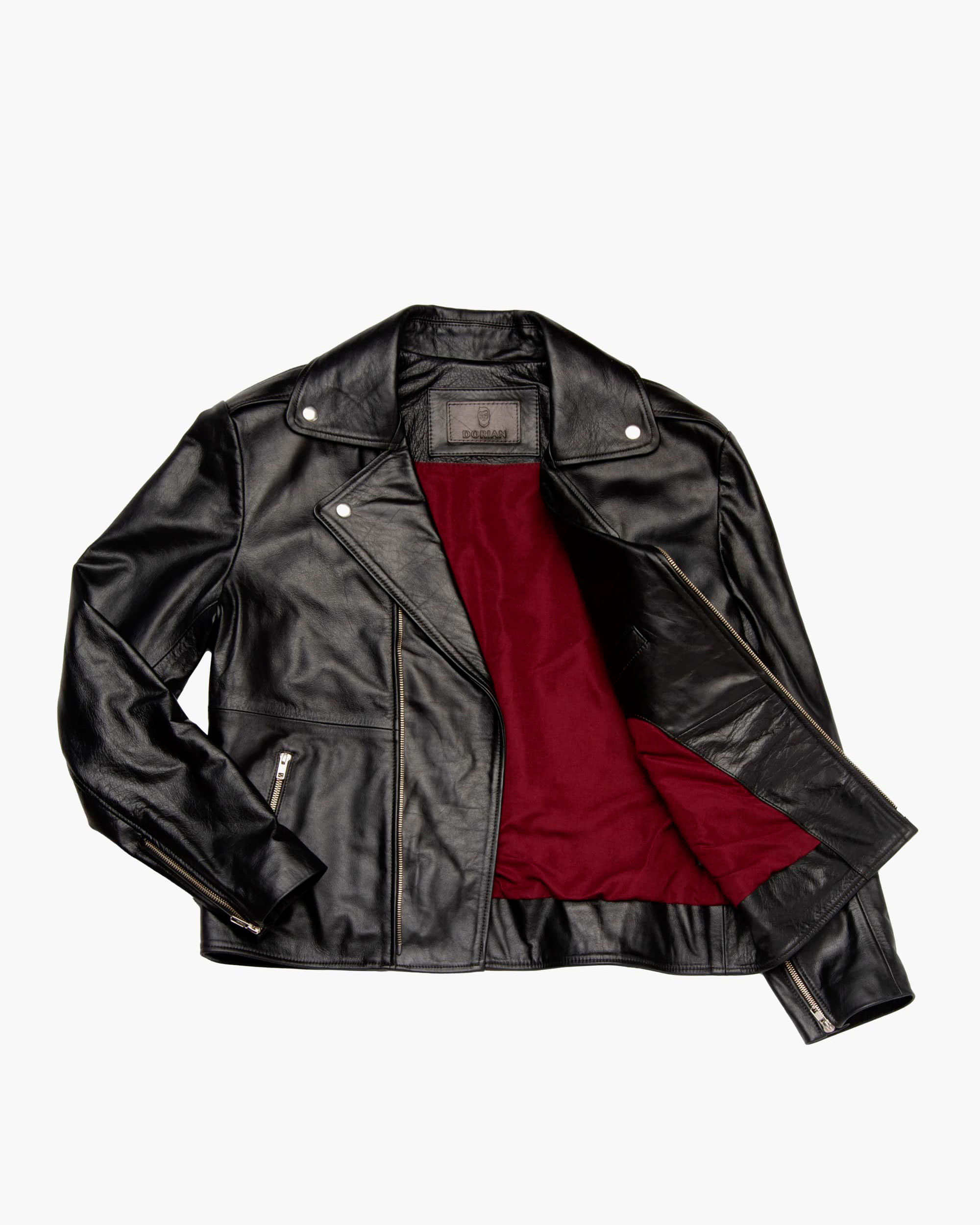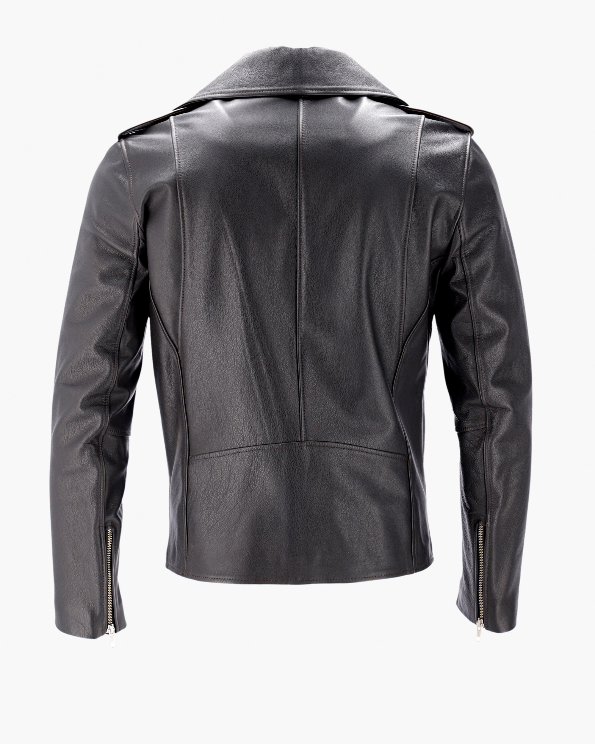 Handcrafted jacket made from genuine cowhide leather, guaranteeing quality and durability. Slim fit, classic design with silver details, epaulettes on the shoulders, rivets on the lapels, and a diagonal chest zipper.