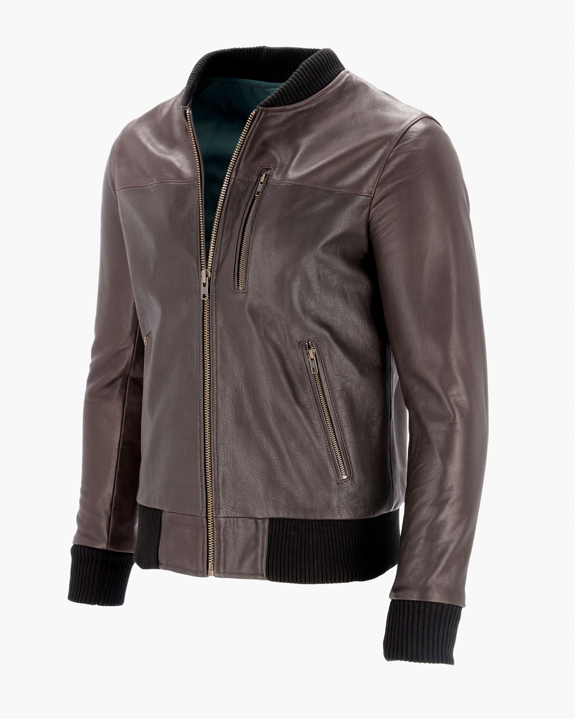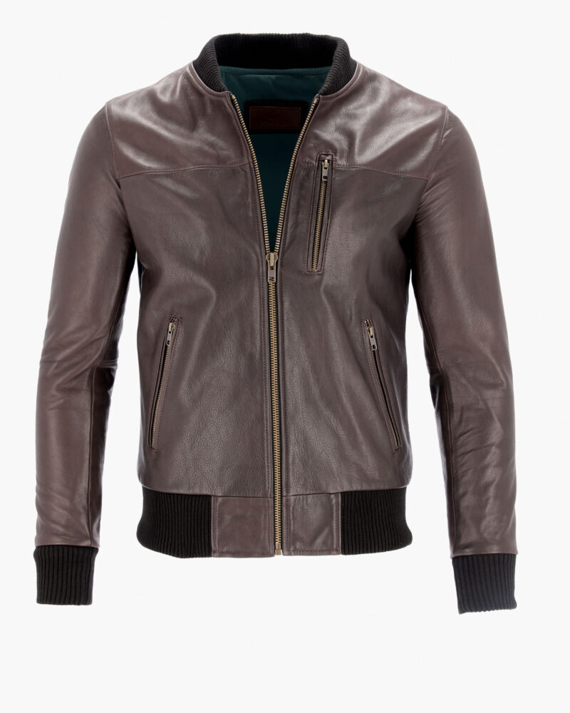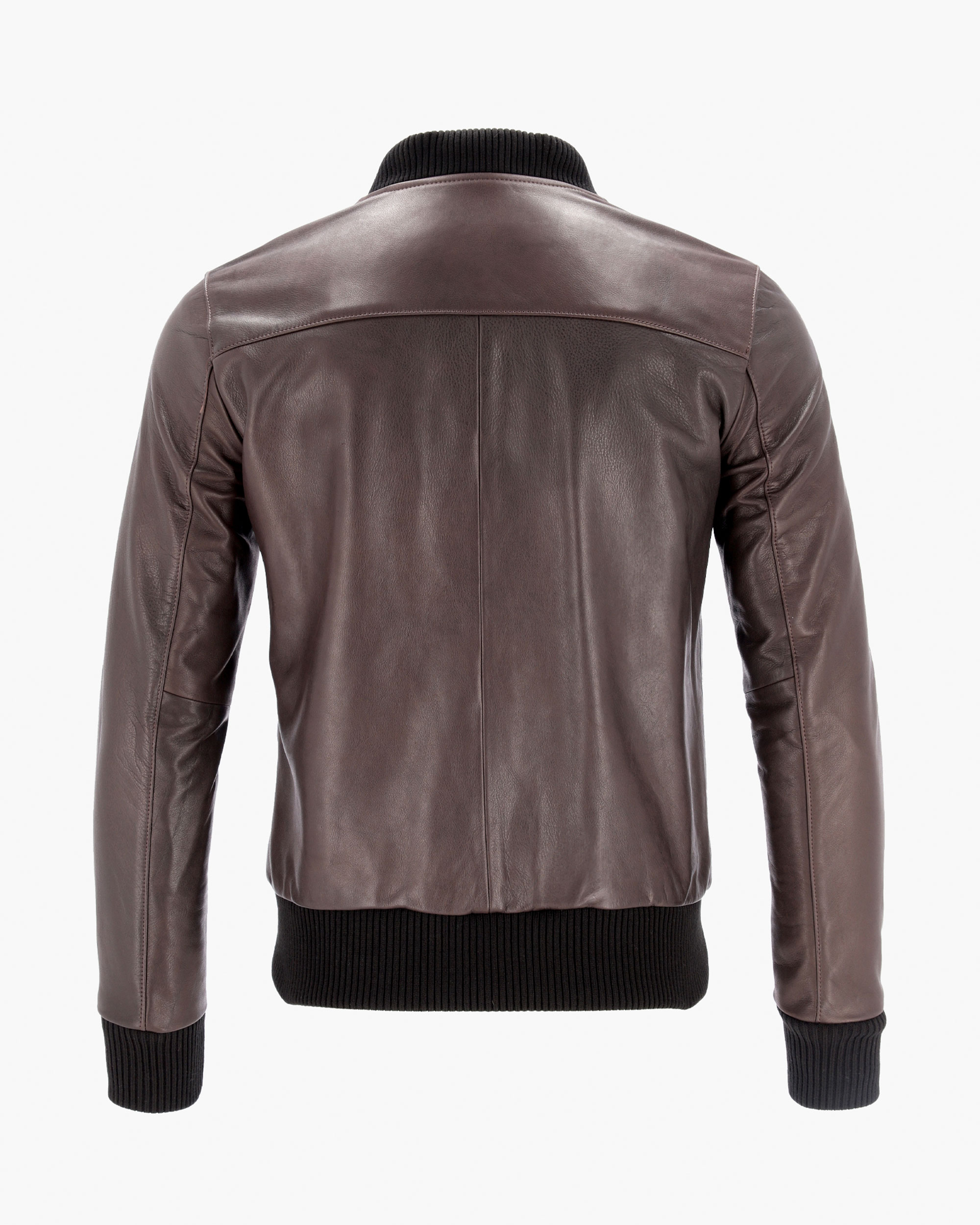 Handcrafted jacket made from genuine cowhide leather, guaranteeing quality and durability. Ribbed detailing at the collar, waistband, and cuffs. Side pockets with metal zippers.