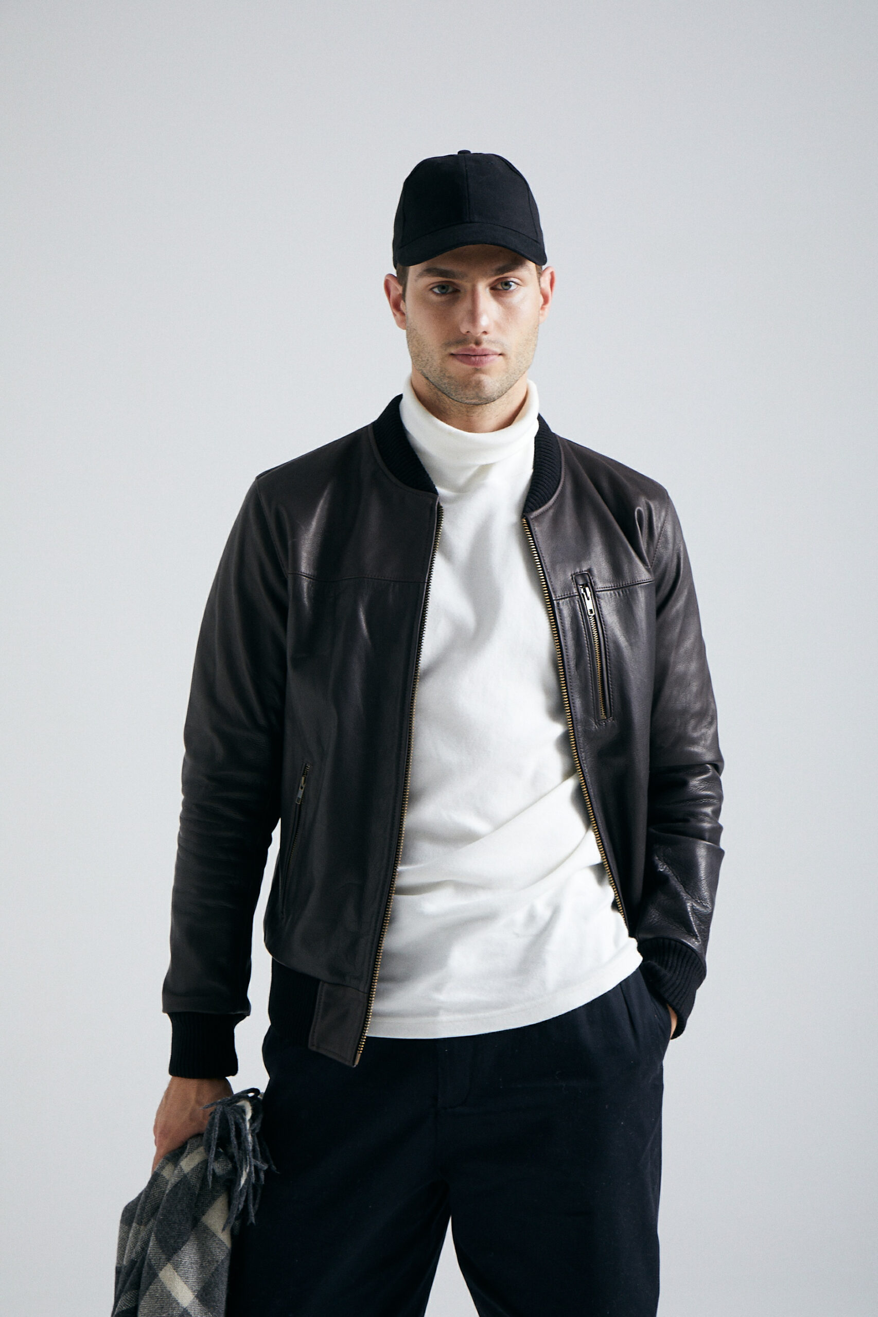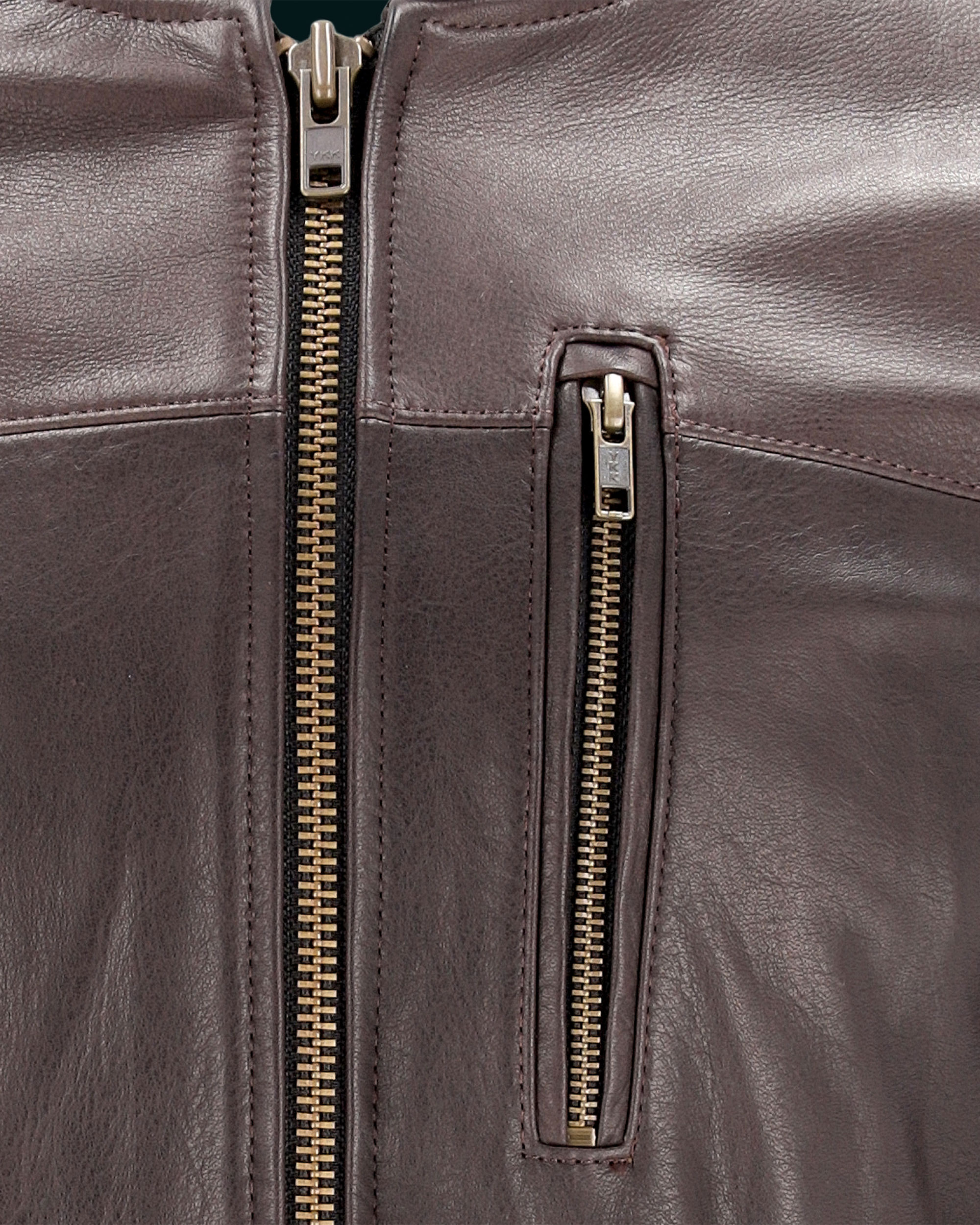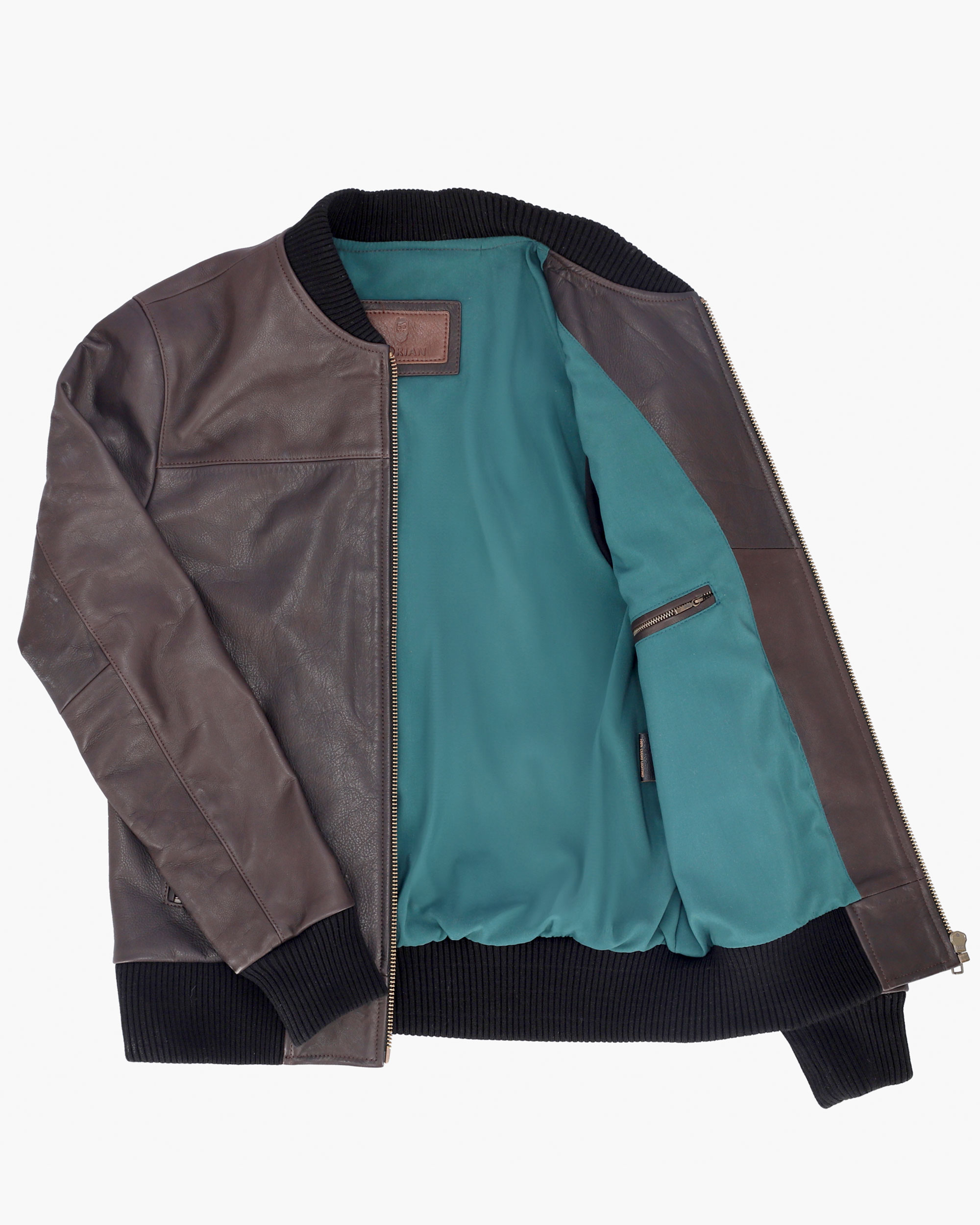 Handcrafted jacket made from genuine cowhide leather, guaranteeing quality and durability. Ribbed detailing at the collar, waistband, and cuffs. Side pockets with metal zippers.