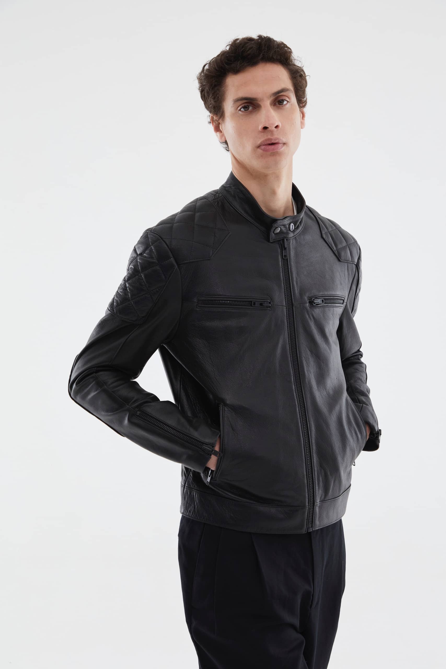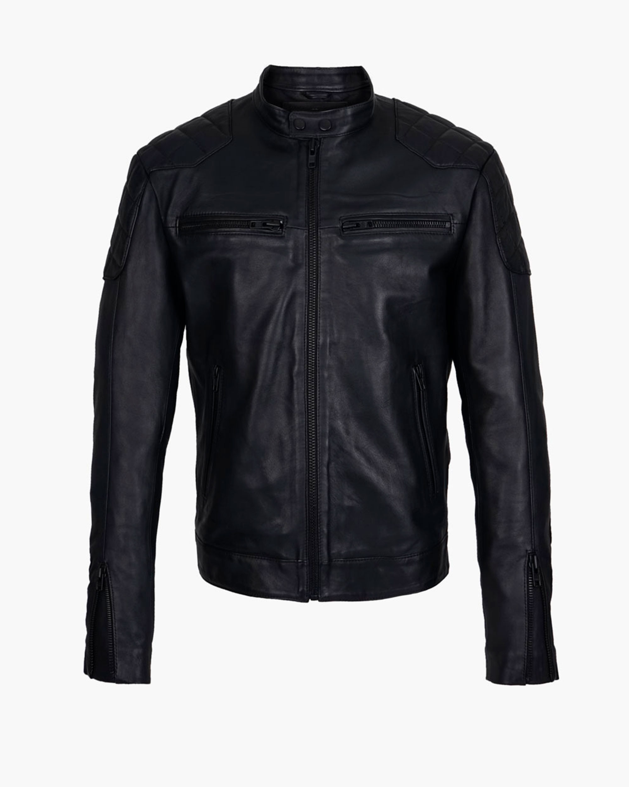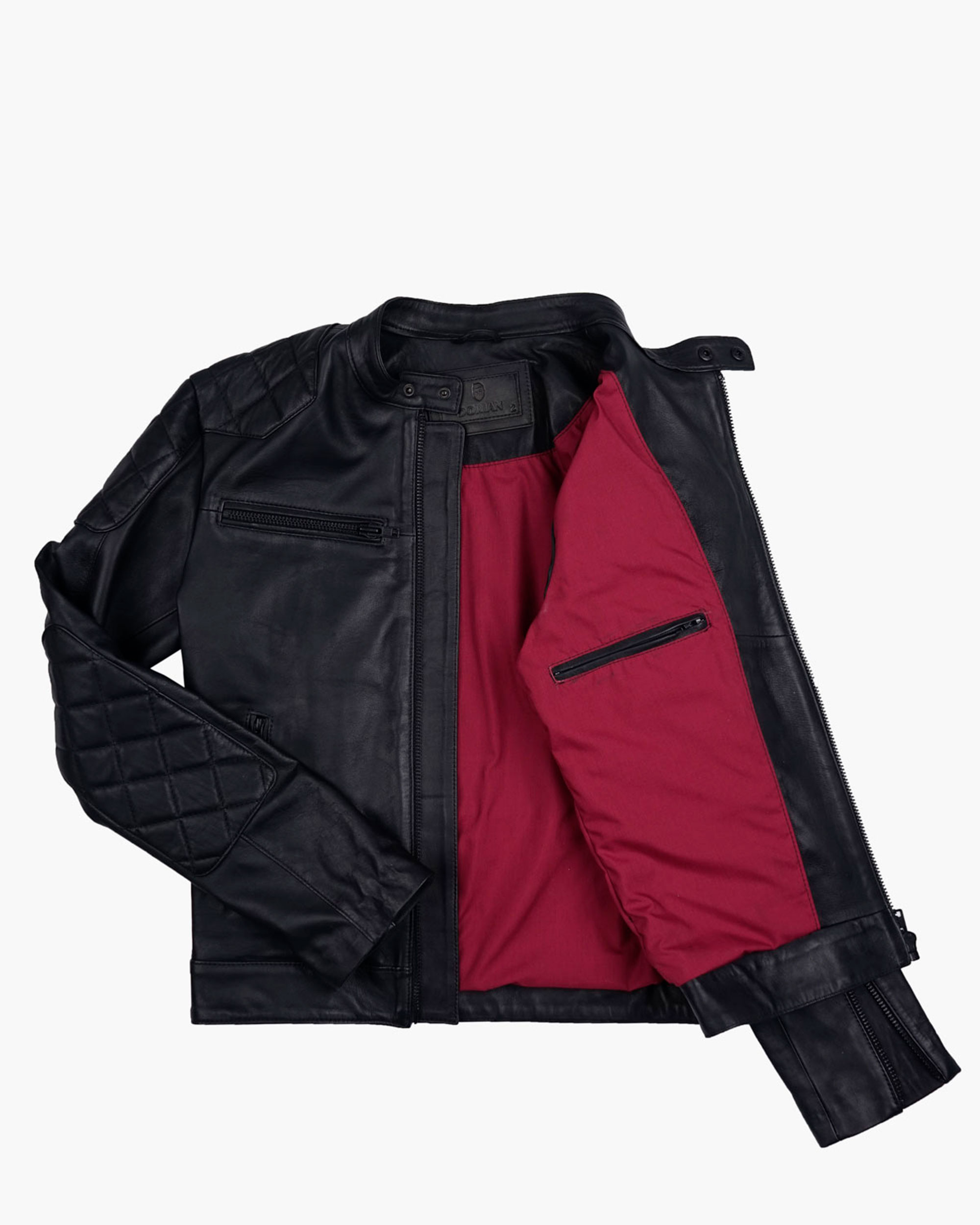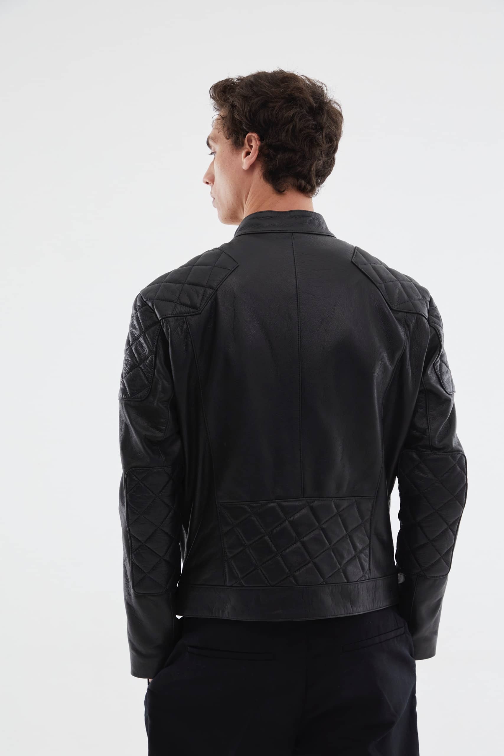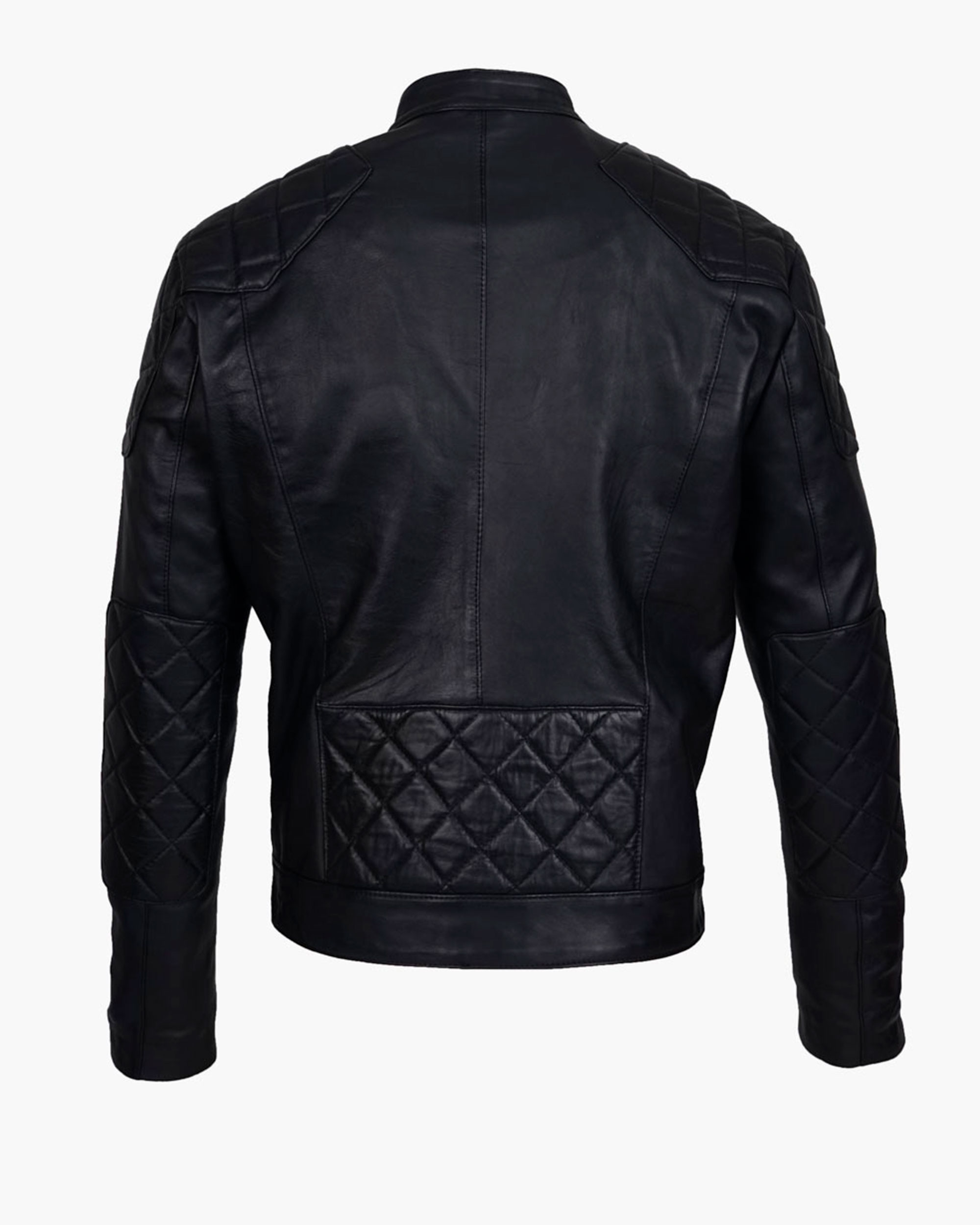 Handcrafted jacket made from 100% genuine cowhide leather. Classic design with black and bronze zippers and buttons, quilted detailing on the shoulders, sleeves, and back. Fully lined with suede microfiber. Features an internal pocket.