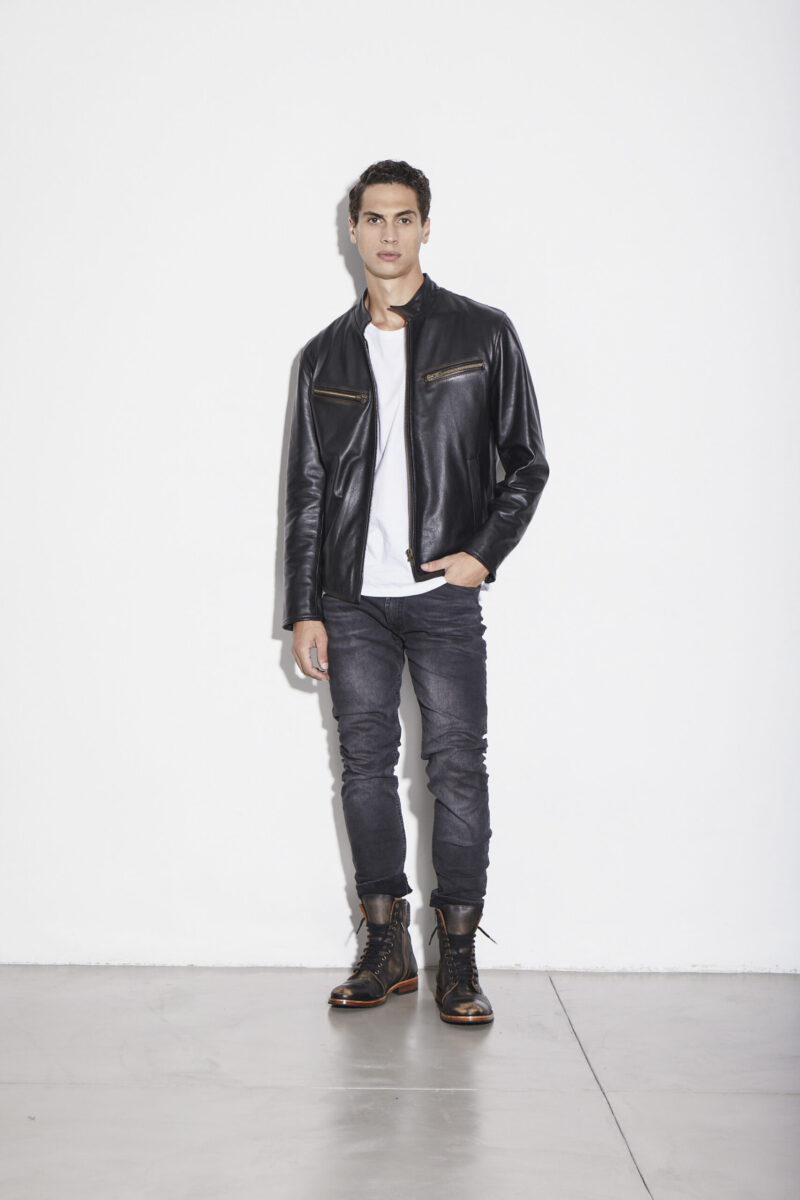Handcrafted jacket made from 100% genuine cowhide leather. Classic design with antique bronze details and a mandarin collar. Features an internal pocket, zippered pockets and cuffs, and a fully lined interior in suede microfiber.