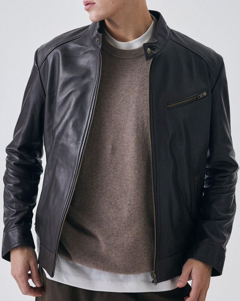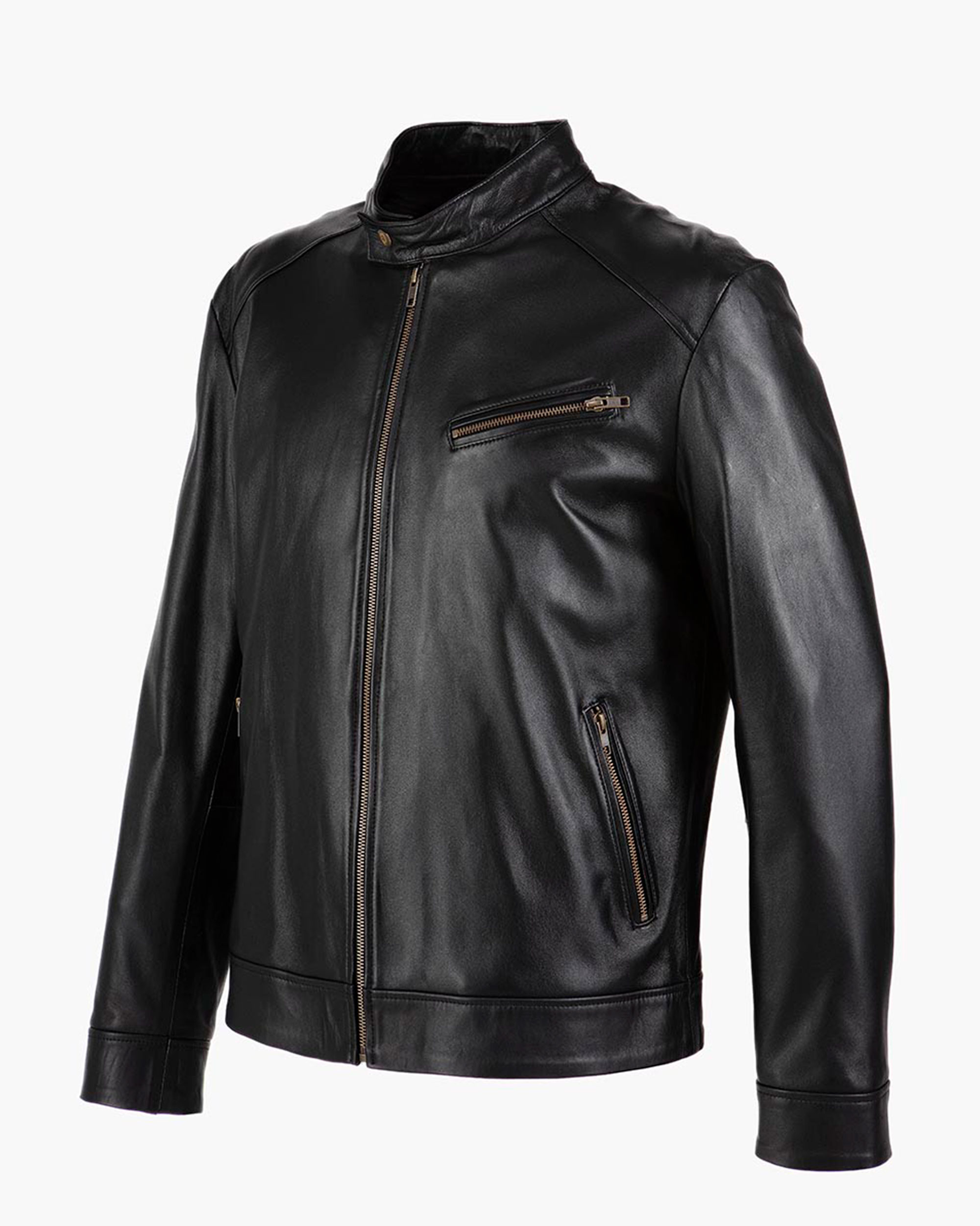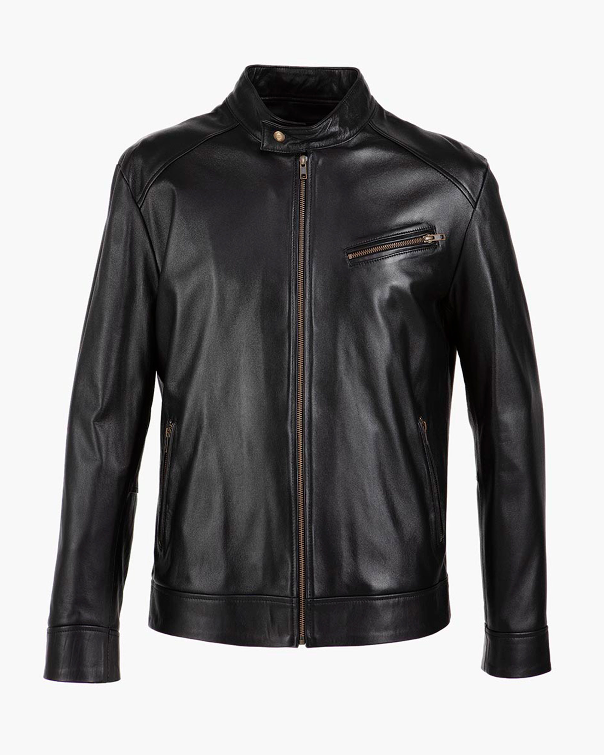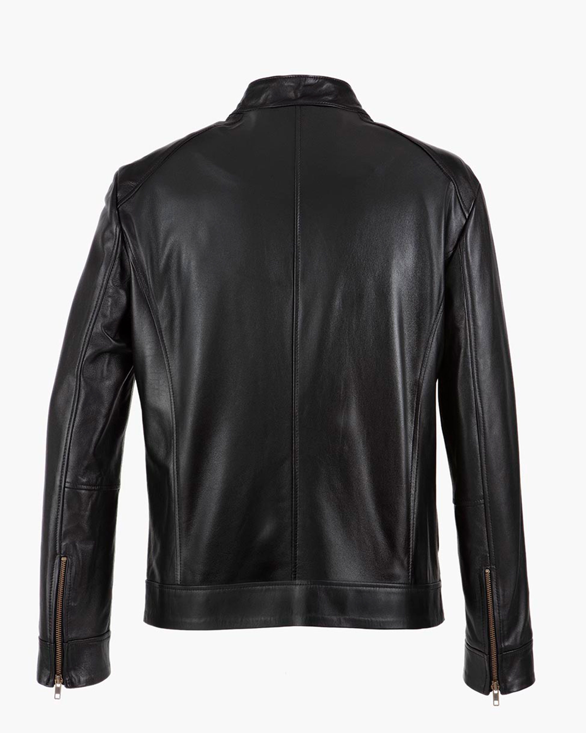 Handcrafted jacket made from 100% genuine Turkish sheepskin leather. Classic design with antique bronze details and a mandarin collar. Features an internal pocket, zippered pockets and cuffs, and a fully lined interior in suede-like microfiber.