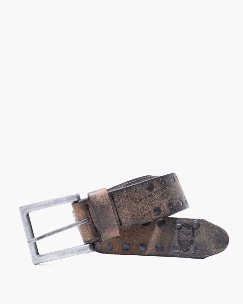 One-piece, 40mm cowhide leather belt. Black-dyed edge. Antique silver-plated buckle and hand-hammered studs. The perfect accessory to complement your footwear, as it not only cinches your waist but also adds presence and color to your look. Ideal for casual wear.
