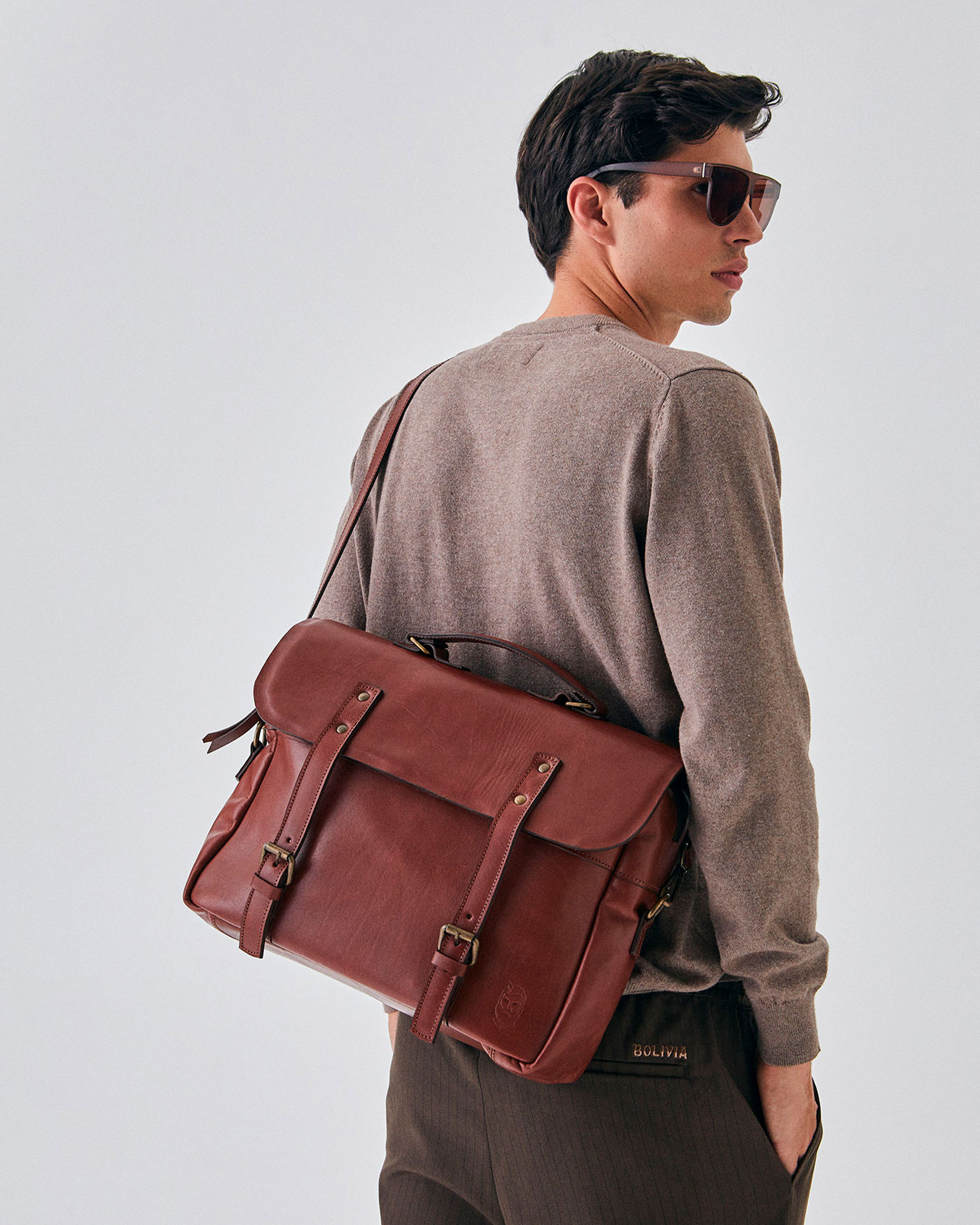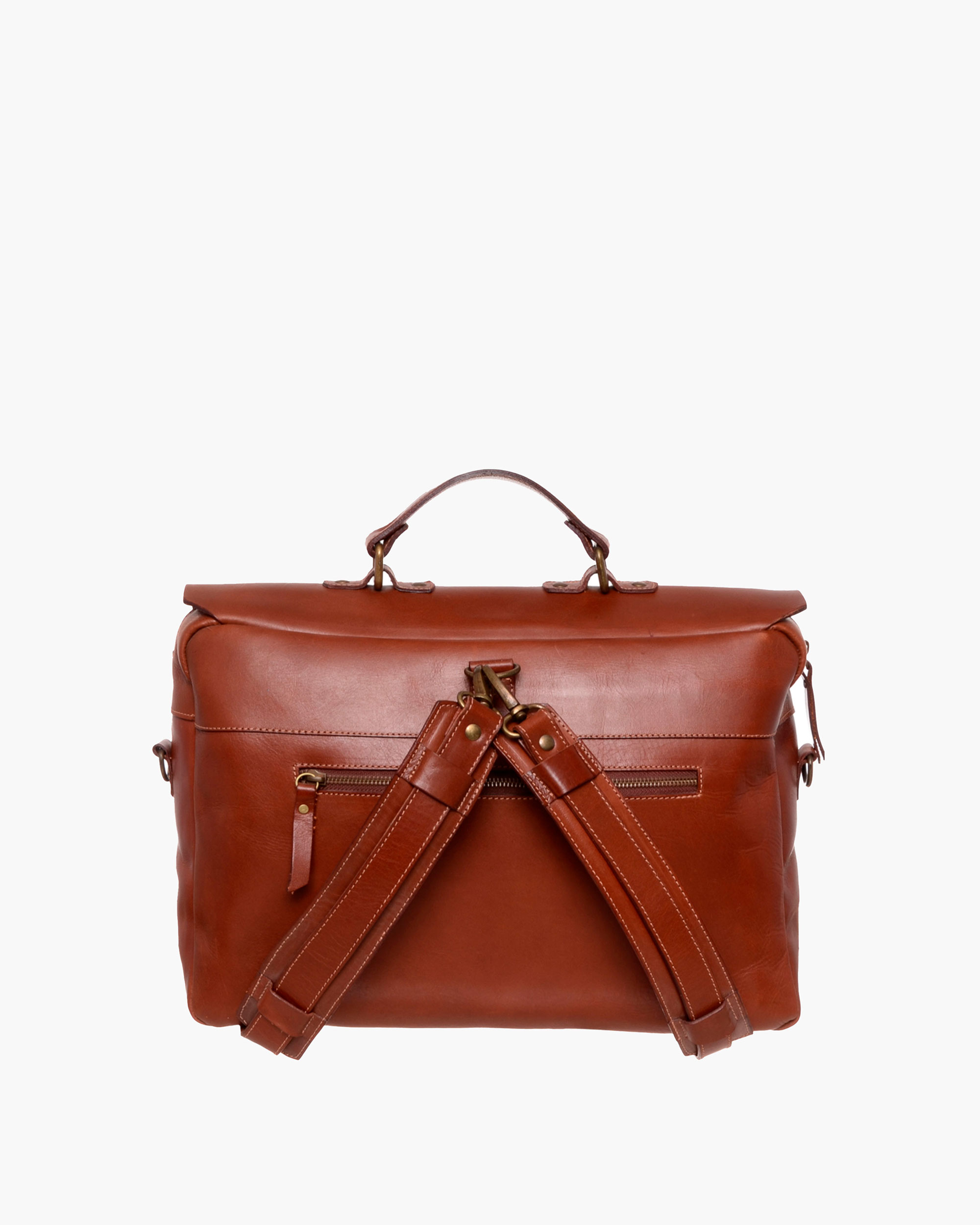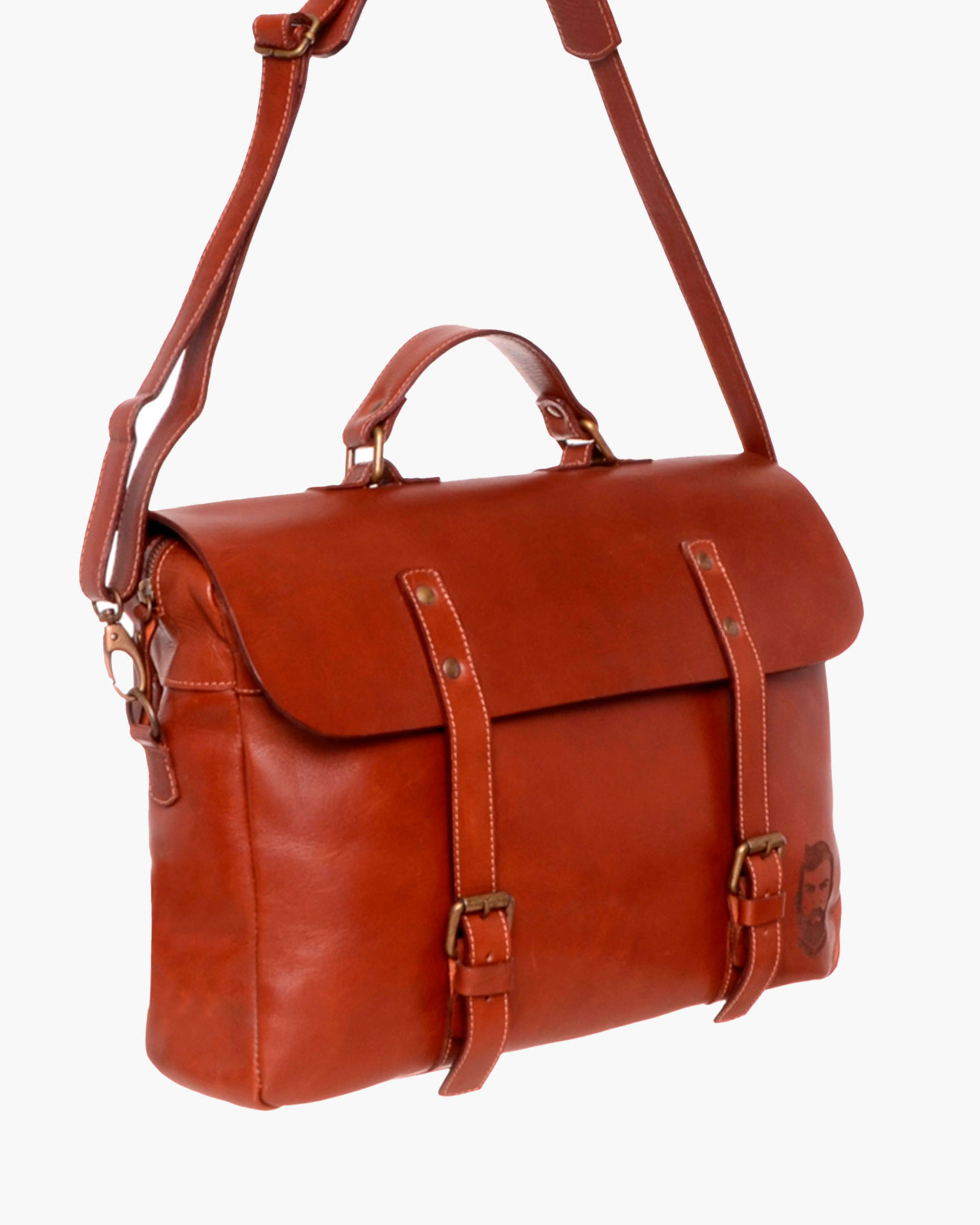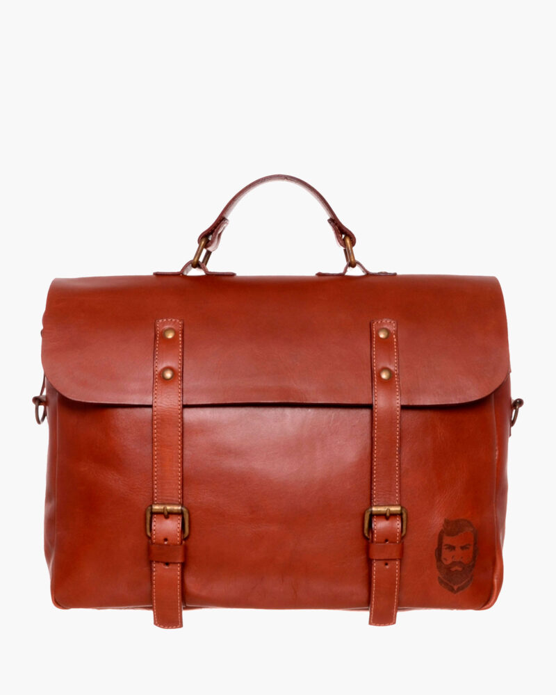 Handcrafted leather satchel made from genuine cowhide. Features a main zippered compartment and a flap with magnetic snaps, plus a versatile handle that transforms it into a briefcase.
