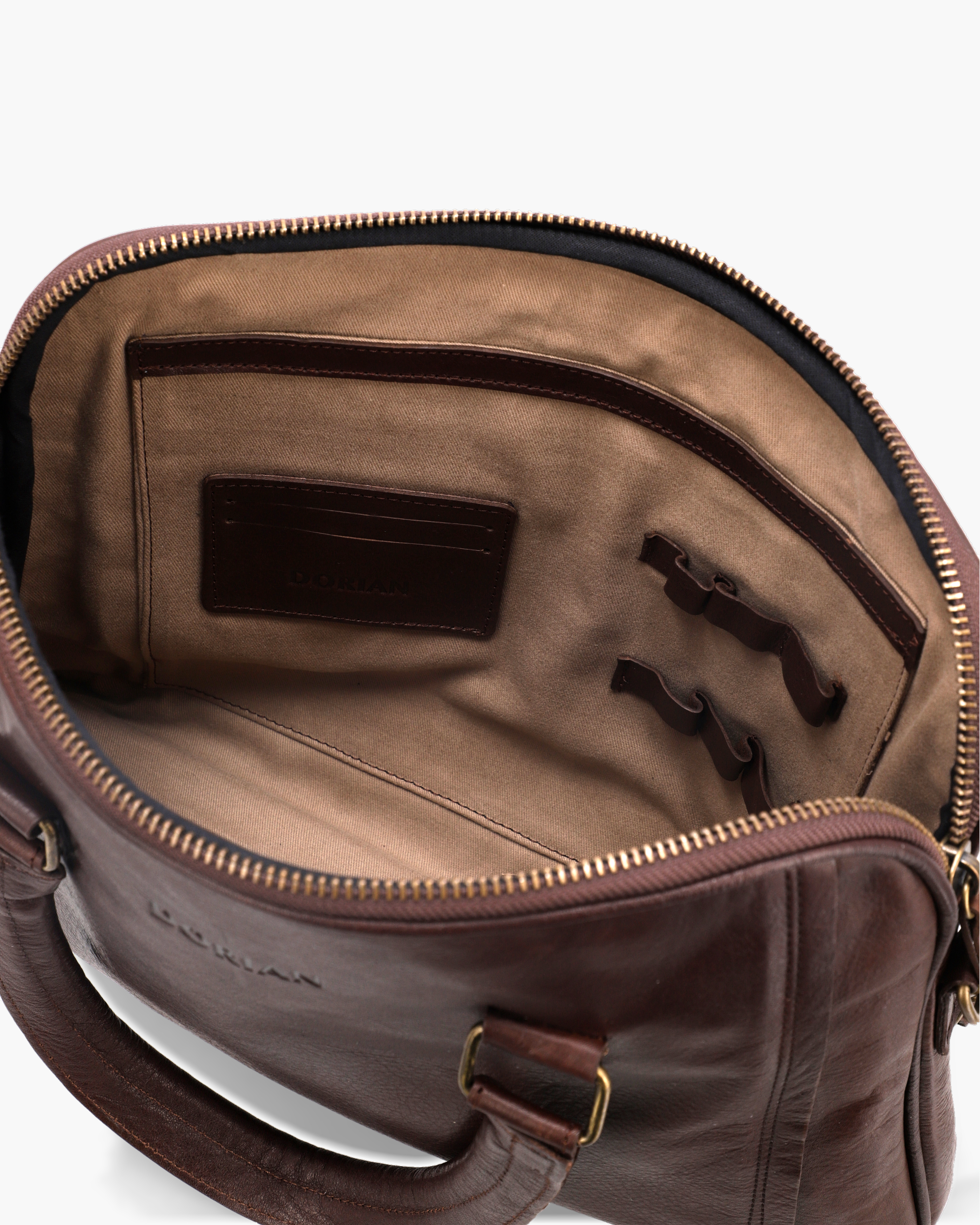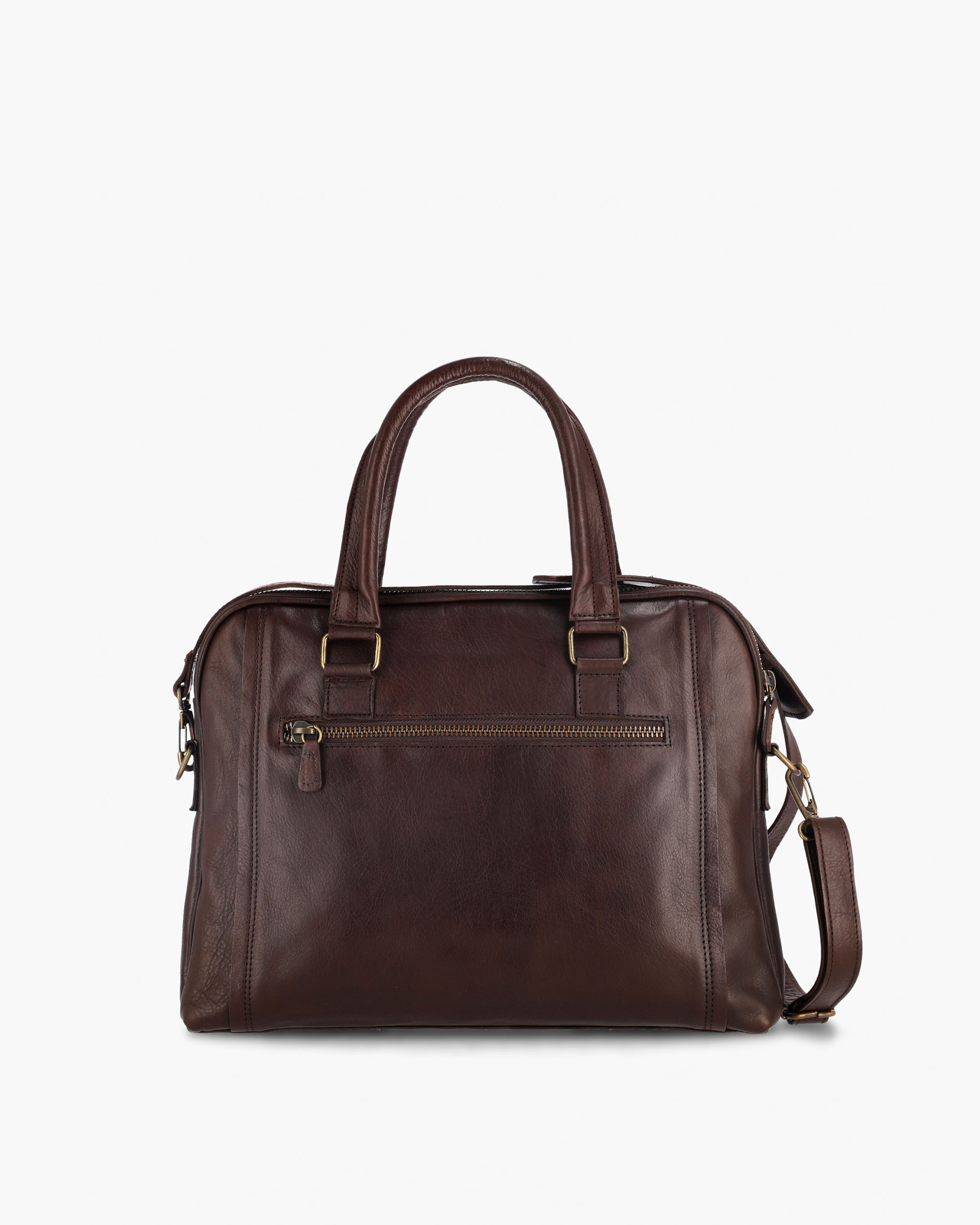 Handcrafted briefcase made of 100% cowhide leather with antique bronze details. It has one external zippered pocket and one internal pocket. Inside, there are several compartments: a zippered pocket, a key clip, a pen organizer and card holder, and ample space for your laptop. You can carry it over your shoulder with the adjustable strap or as a portfolio using the handle.