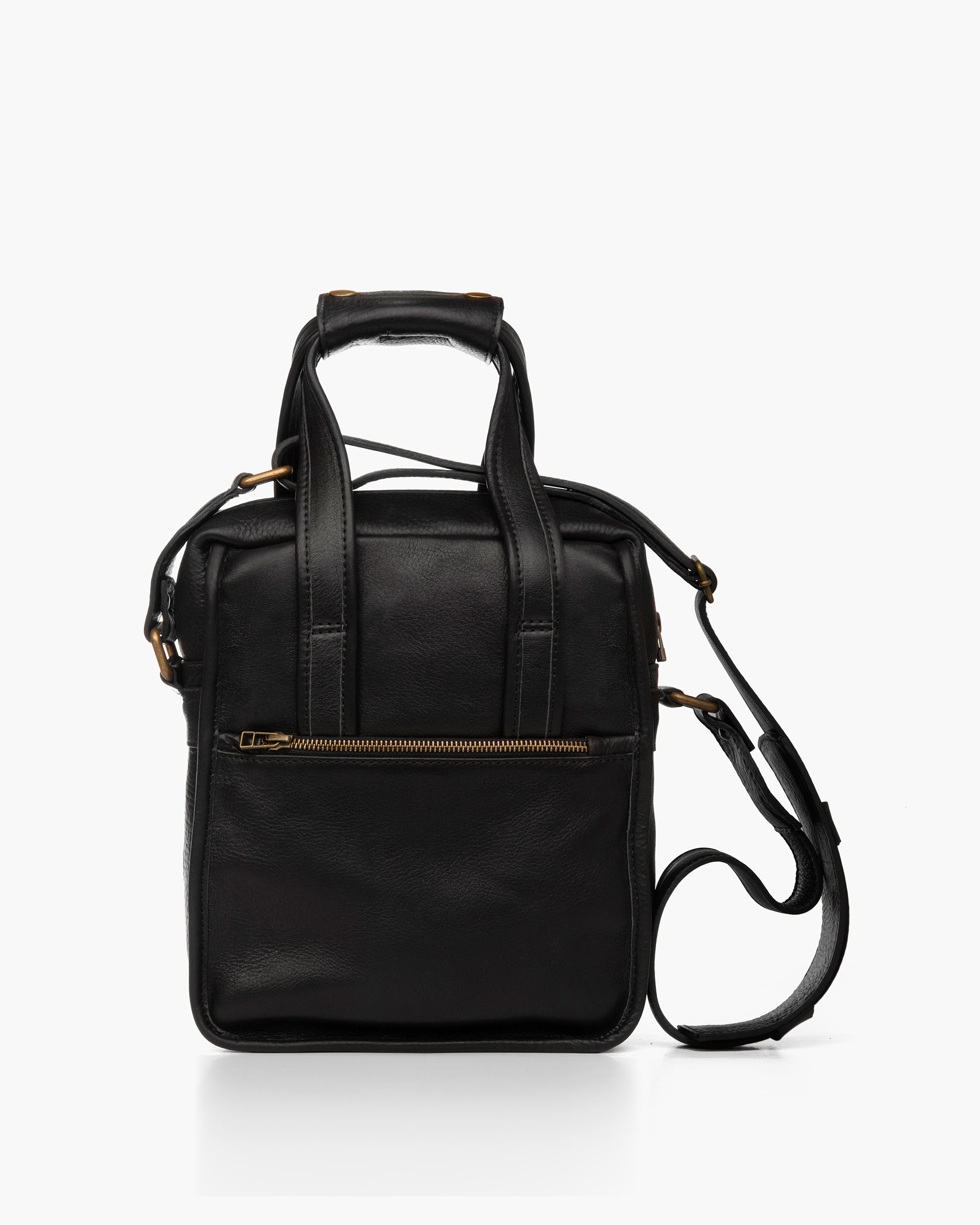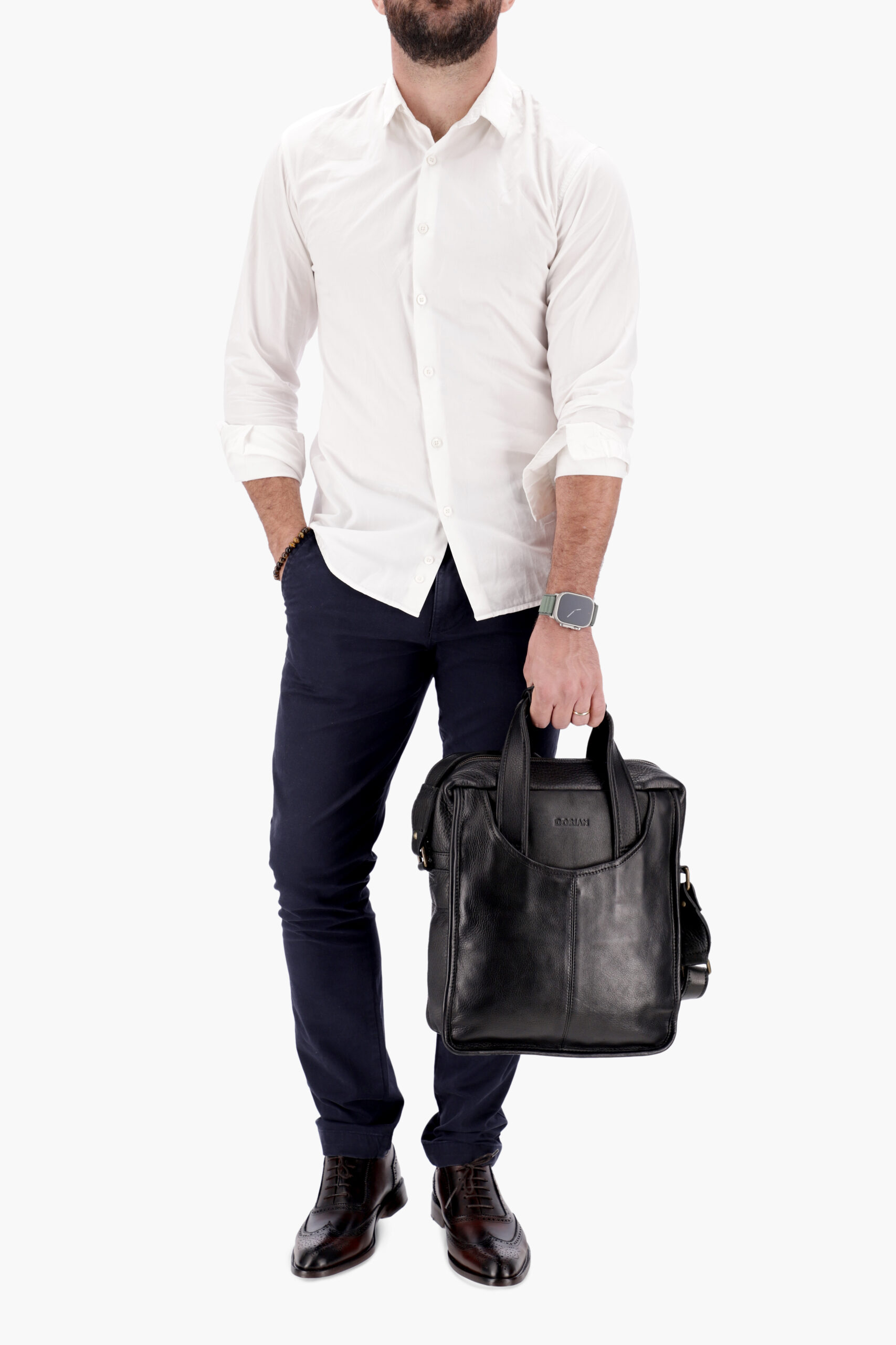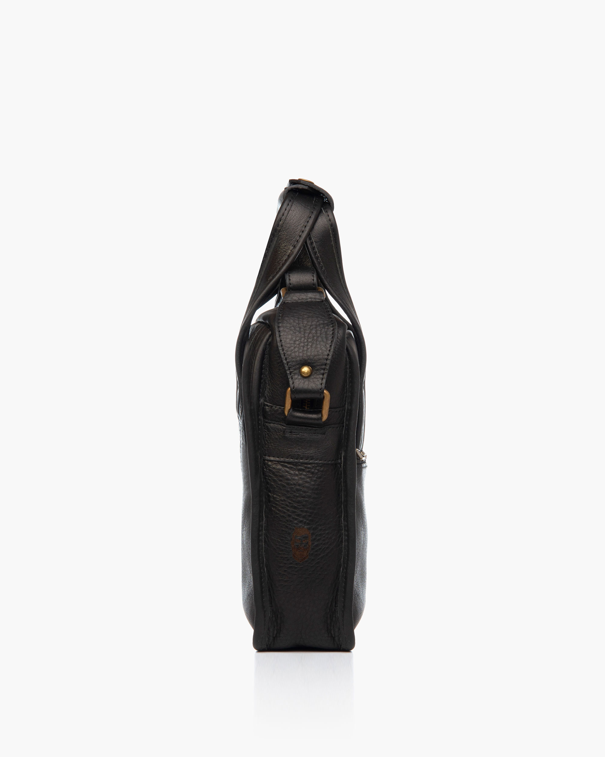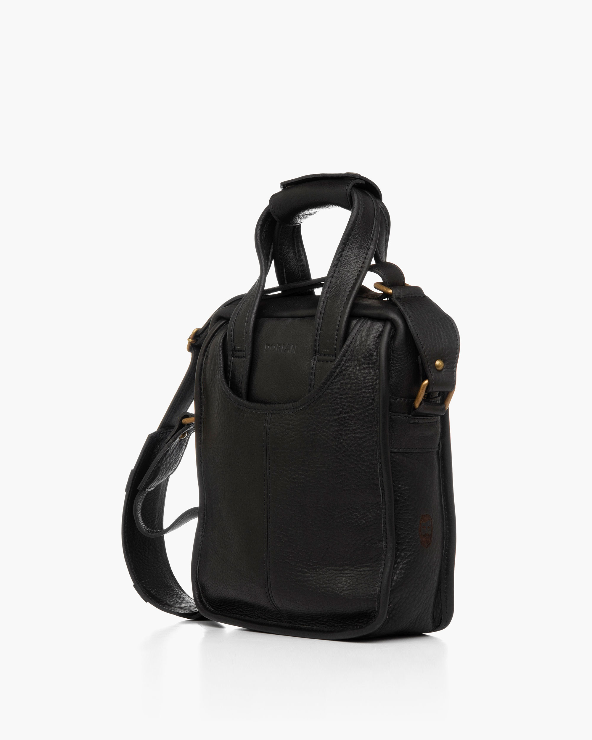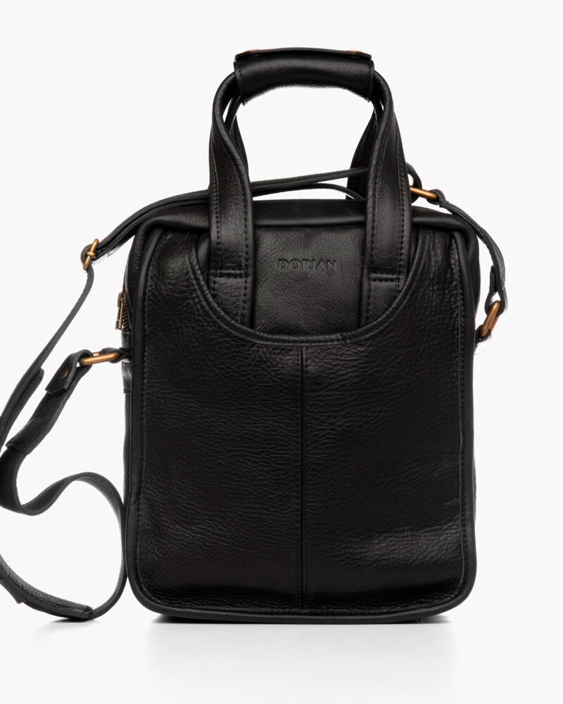 Handcrafted leather satchel made from genuine cowhide. Features external, internal, and side pockets, and a handle that transforms it into a briefcase. The interior is lined with burgundy gabardine fabric.
