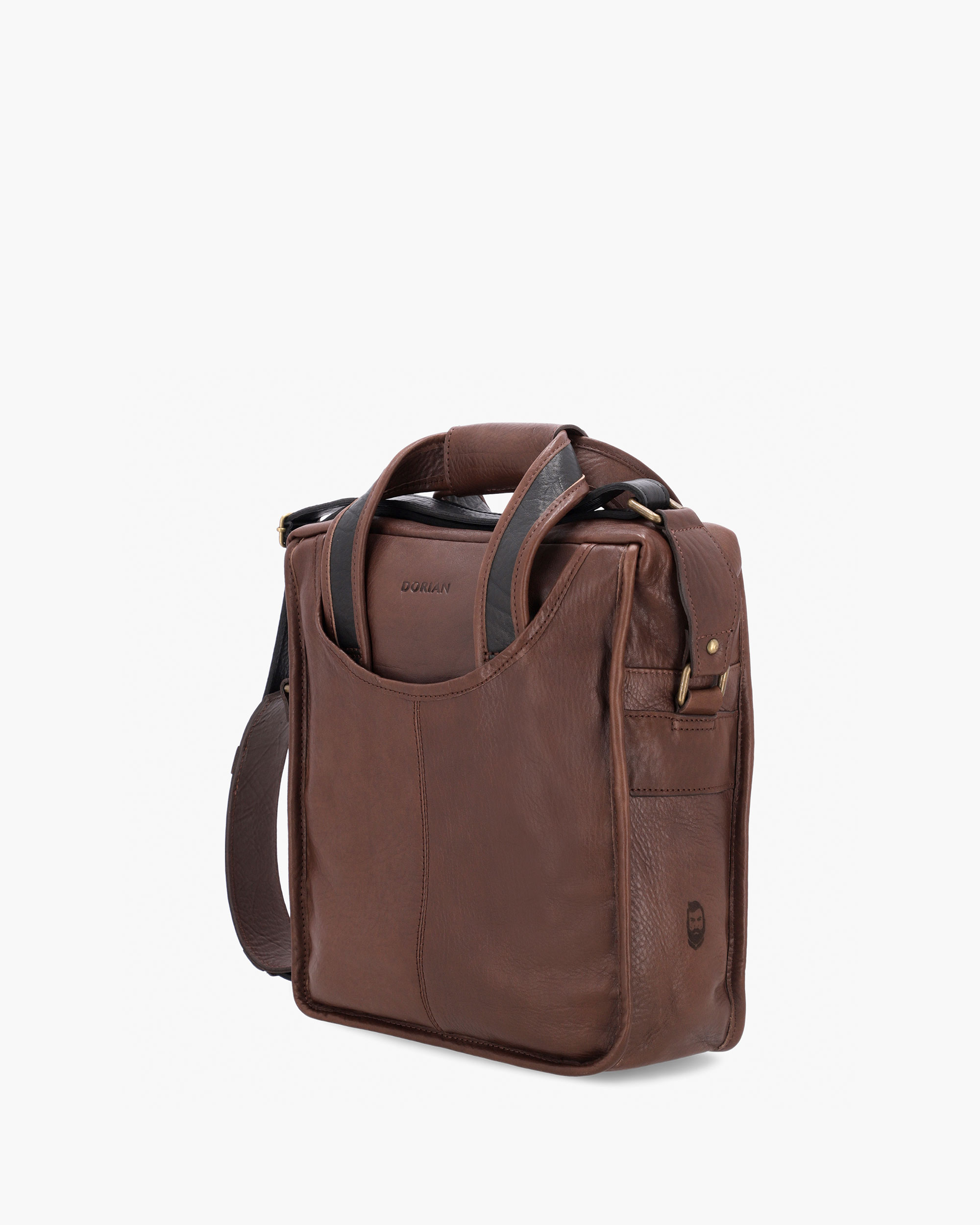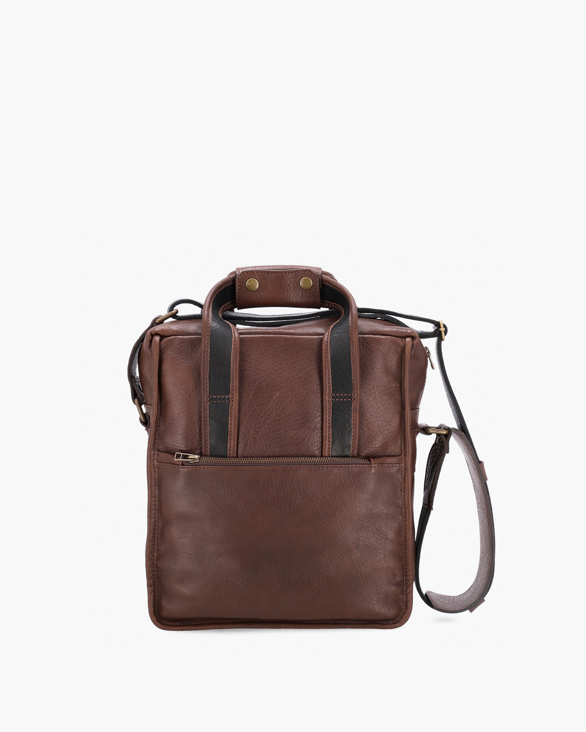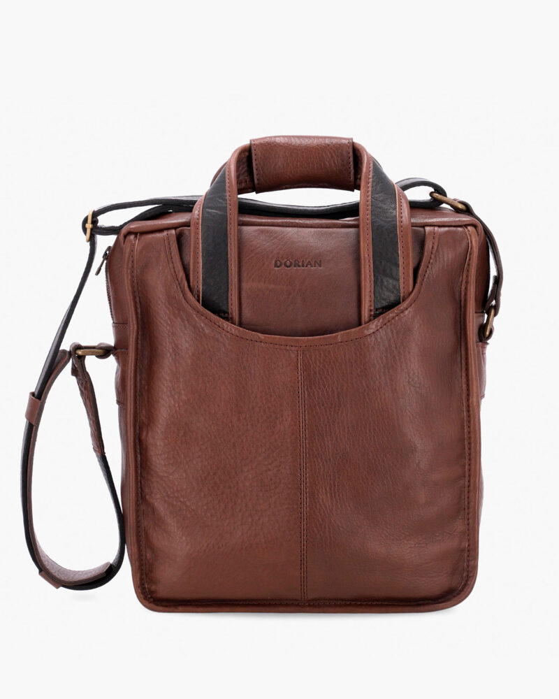 Handcrafted leather satchel made from genuine cowhide. Features external, internal, and side pockets, and a handle that transforms it into a briefcase. The interior is lined with burgundy gabardine fabric.