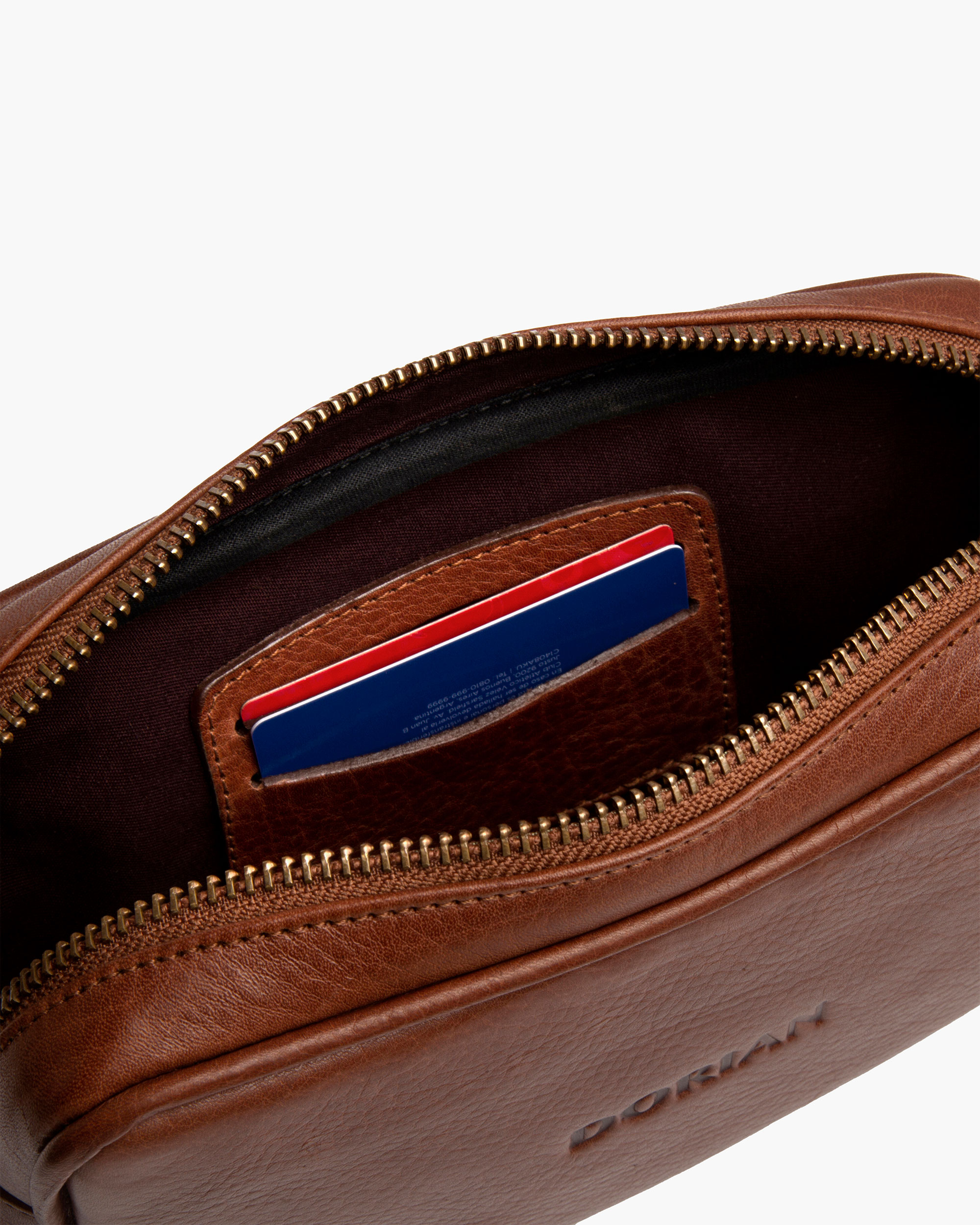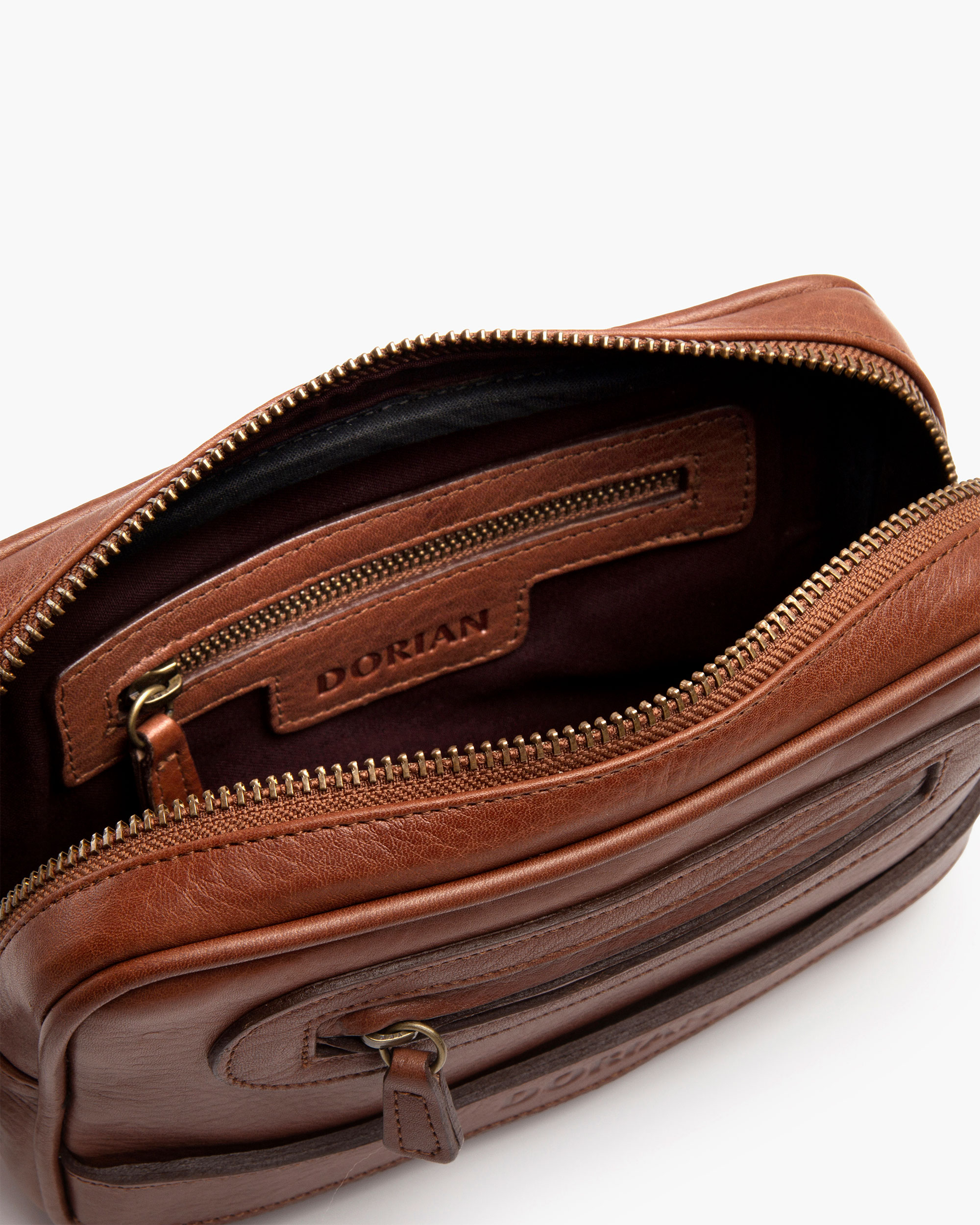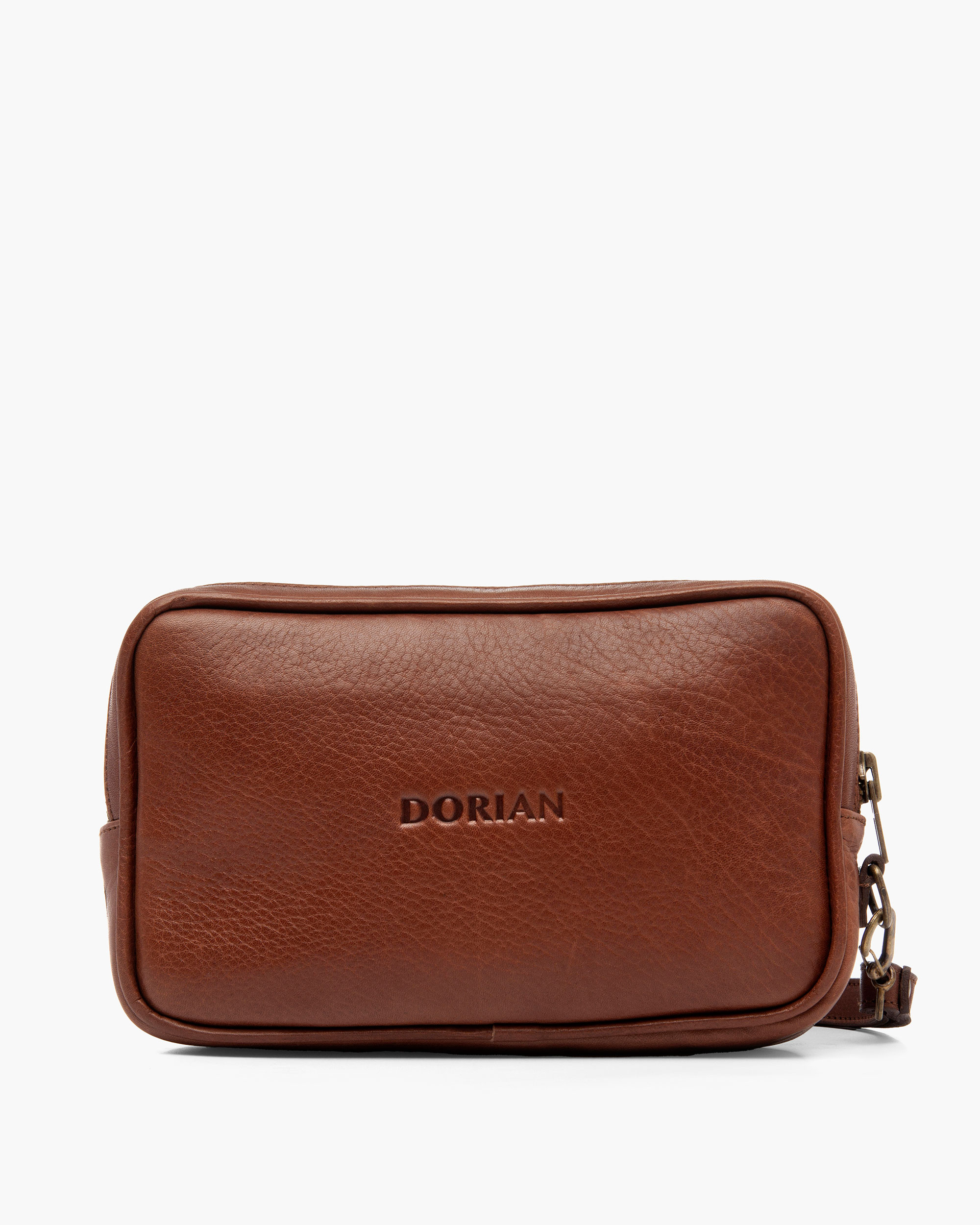 Handcrafted cowhide leather toiletry bag. It features an external zippered pocket for your keys and small items, and a 15 x 3 cm wrist strap.