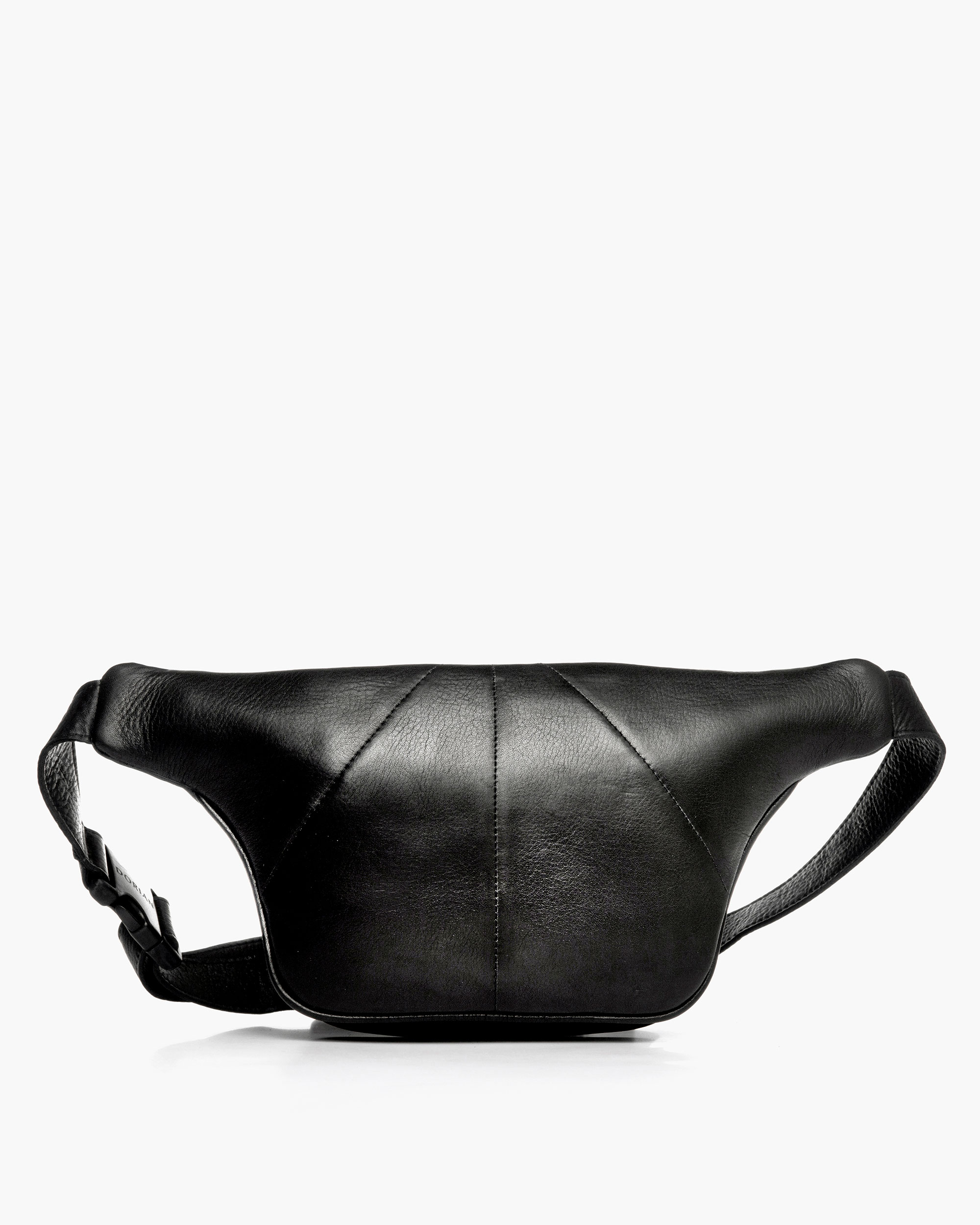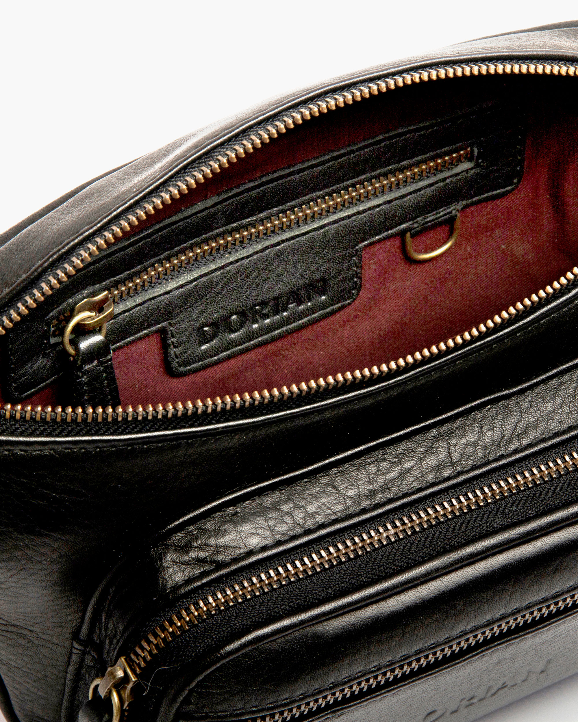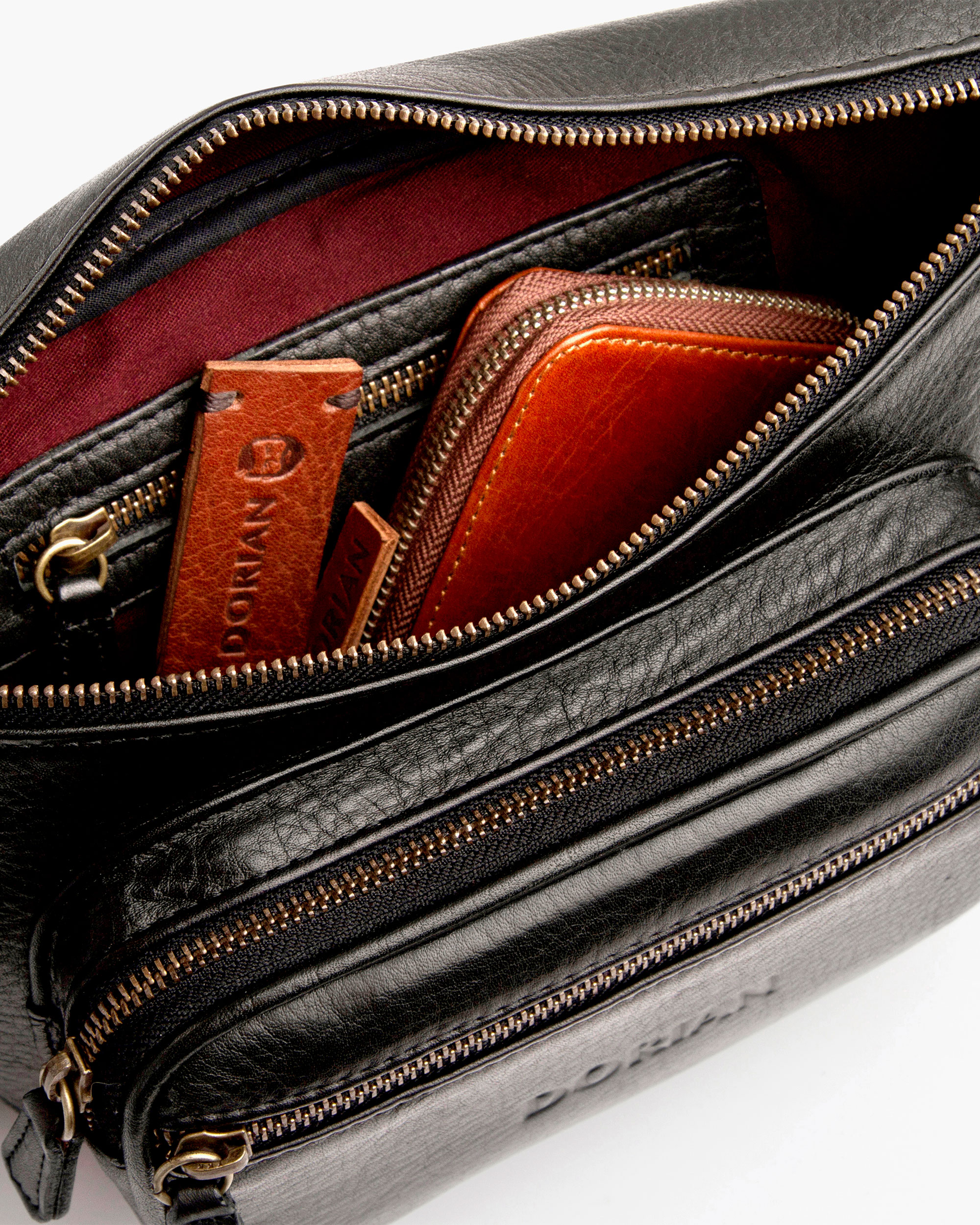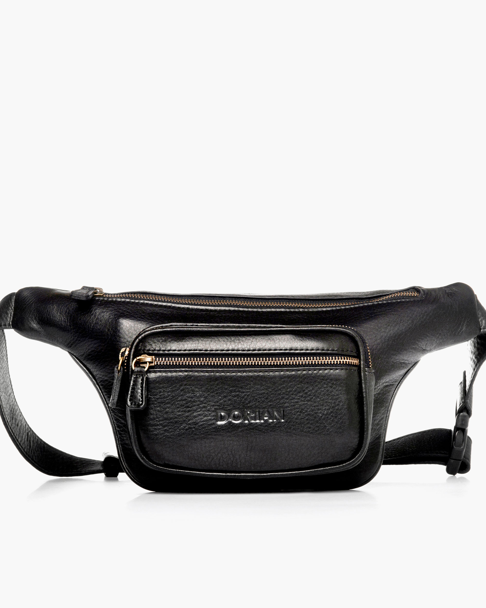 Handcrafted cowhide leather belt bag. It features a spacious main compartment, an internal zippered pocket, a card holder, and two external zippered pockets. The strap is adjustable and has a hook with the DORIAN logo.
