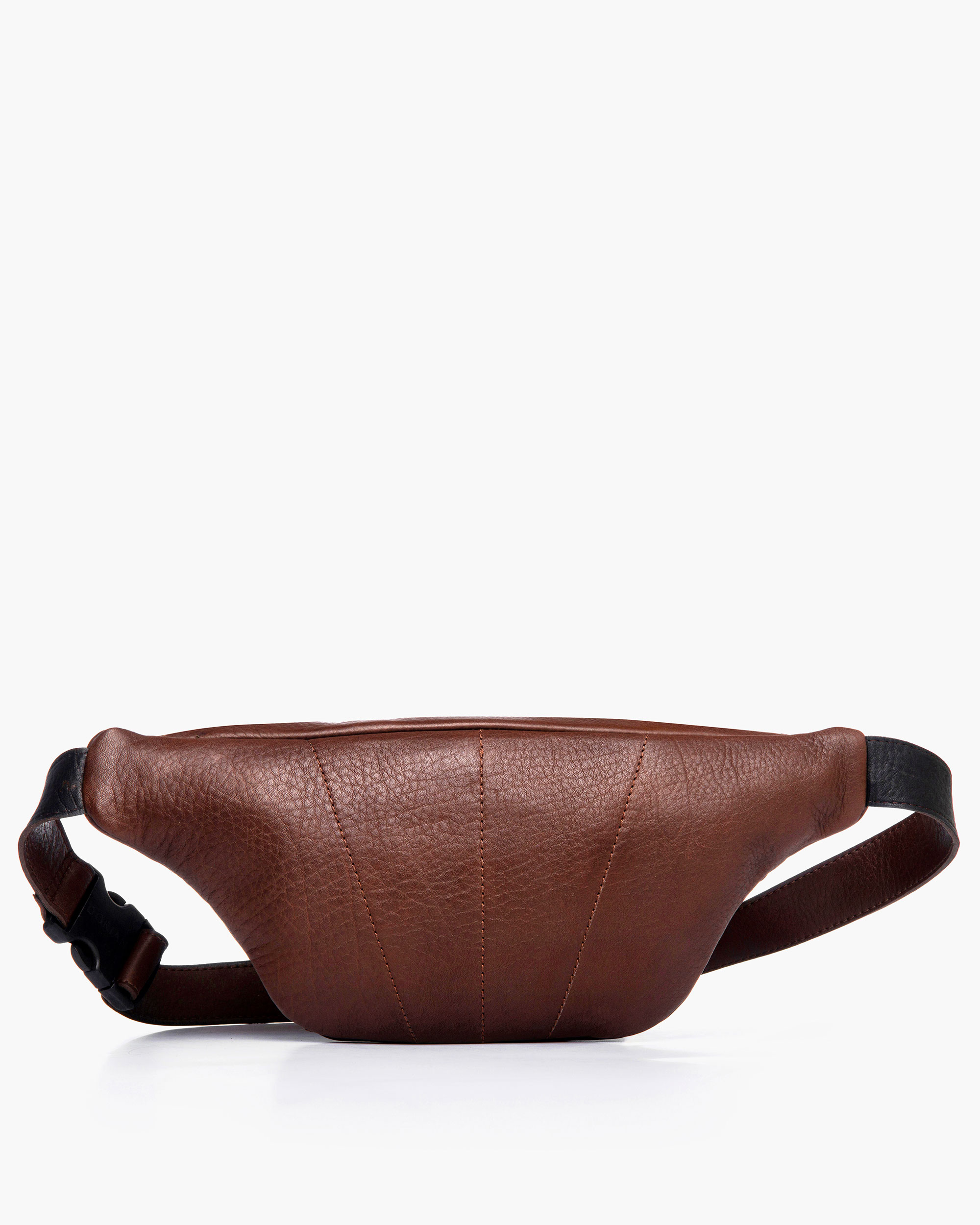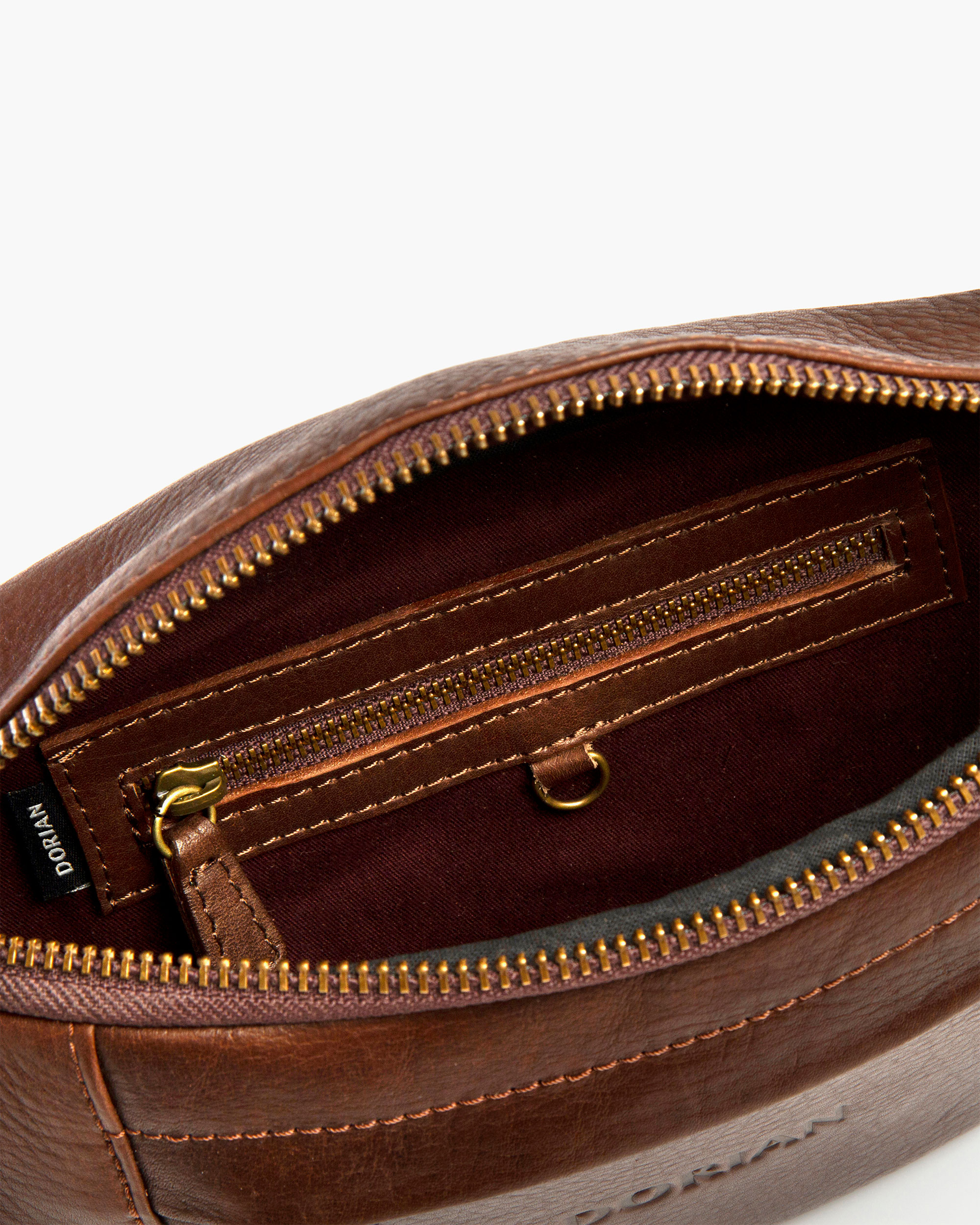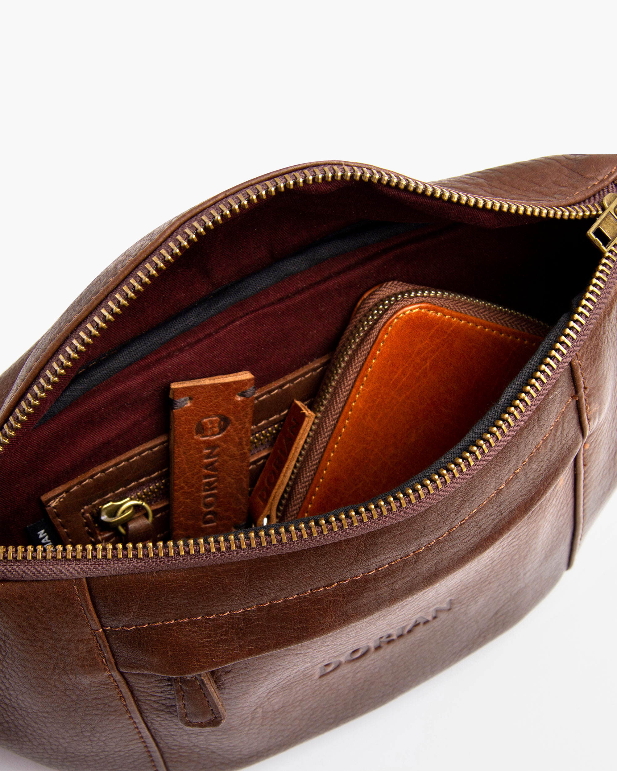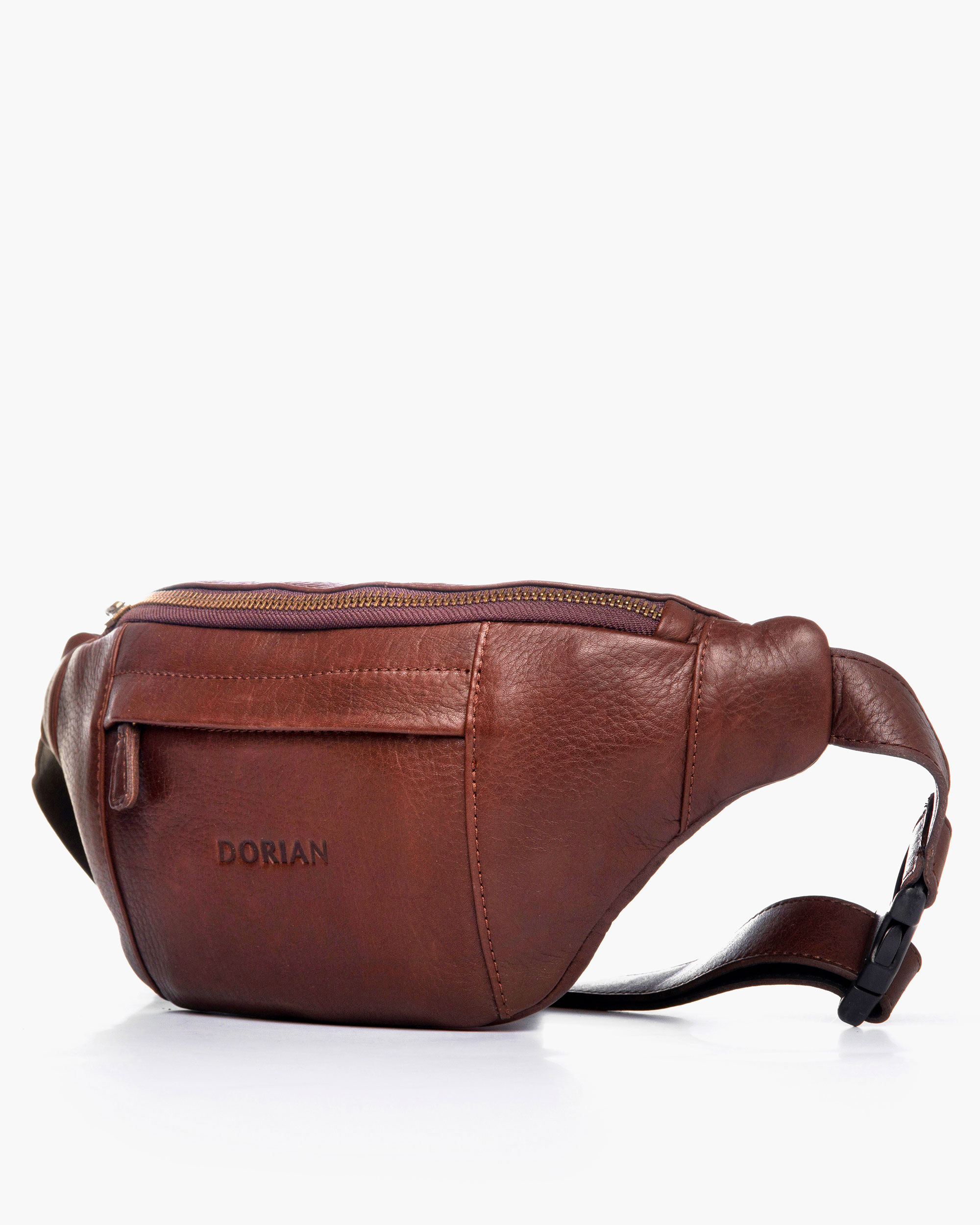 Handcrafted cowhide leather waist bag. It features a spacious main compartment, an internal zippered pocket, and an external zippered pocket. The strap is adjustable and has a hook with the DORIAN logo.