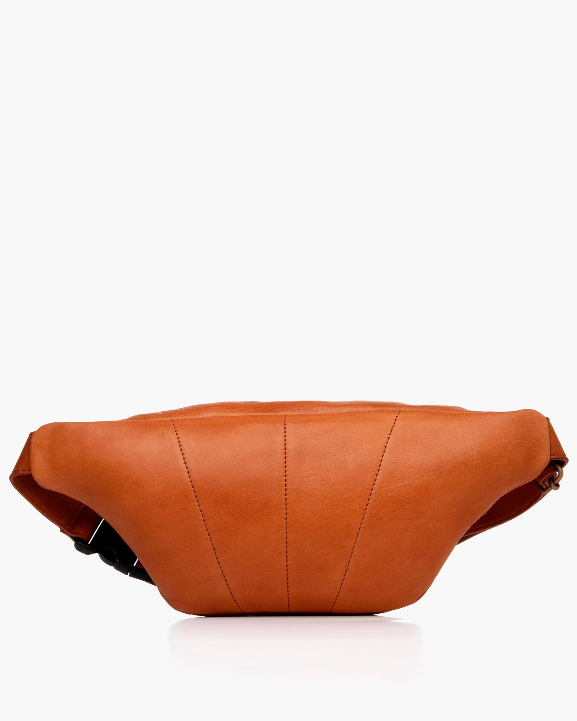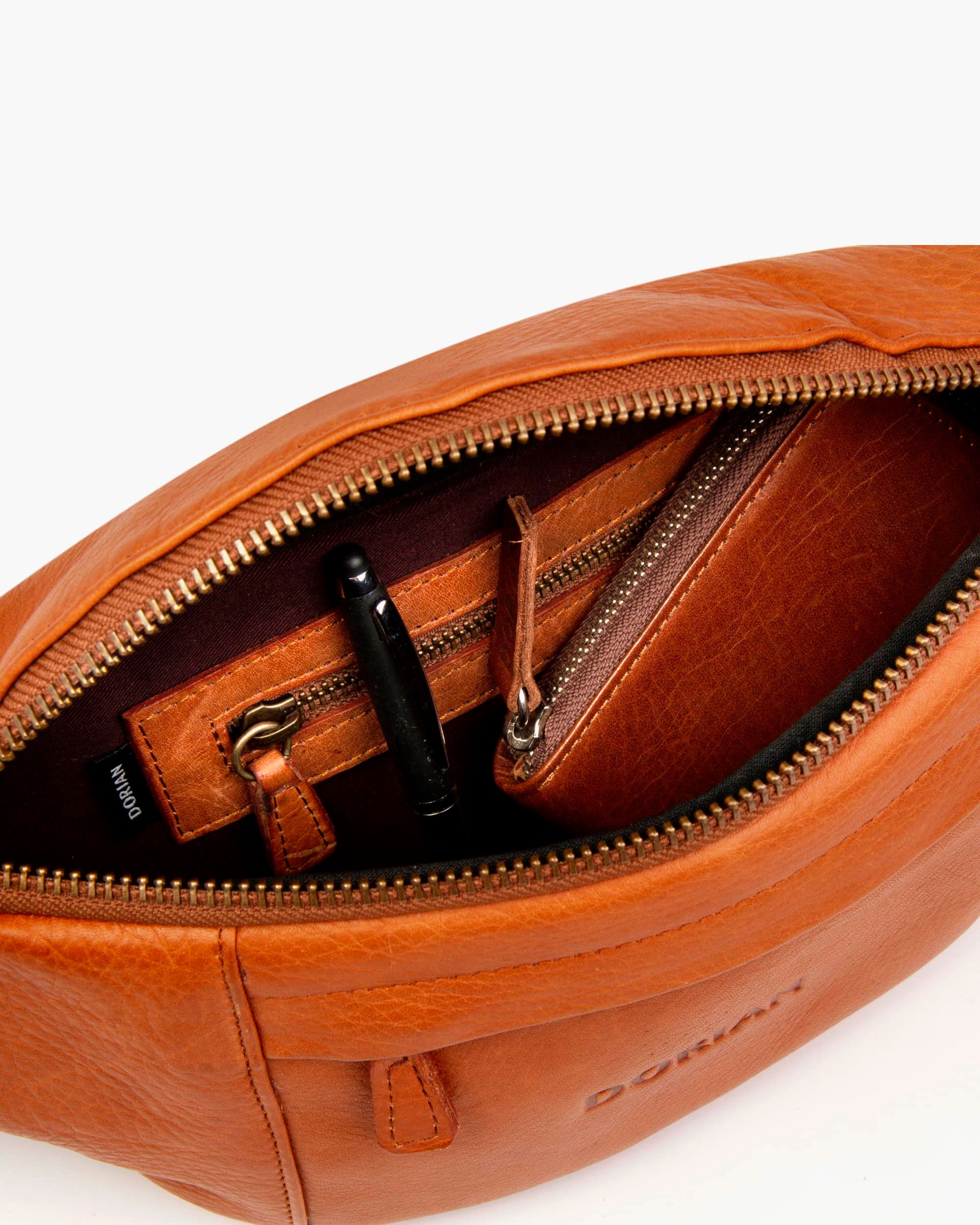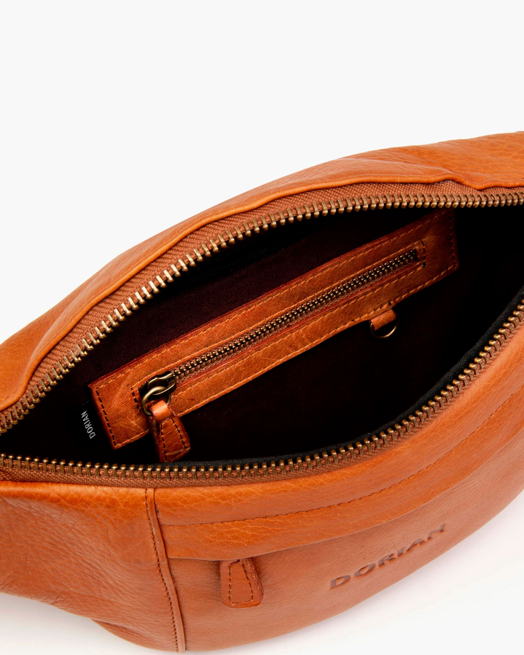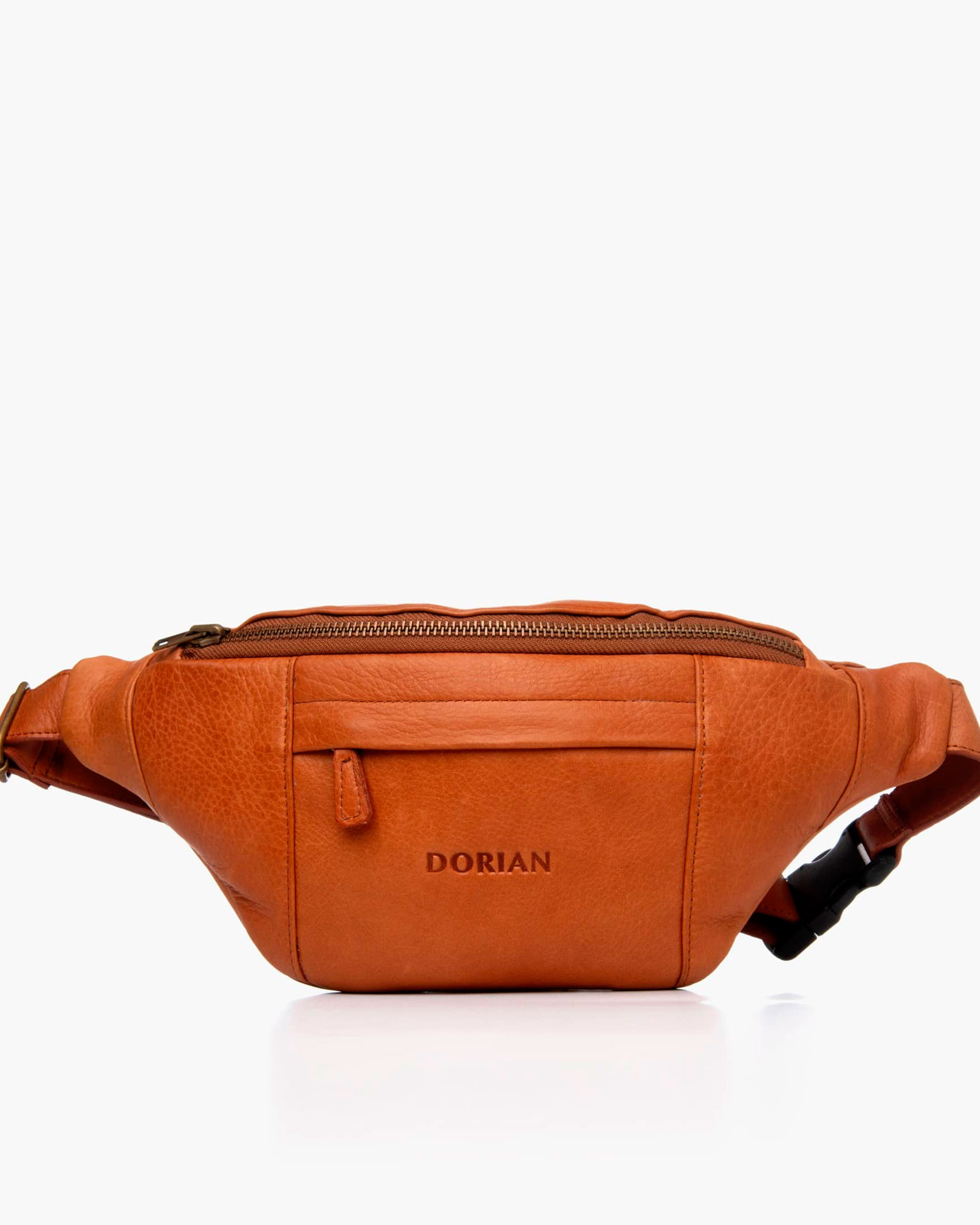 Handcrafted cowhide leather waist bag. It features a spacious main compartment, an internal zip pocket, and an external zip pocket. The strap is adjustable and has a hook with the DORIAN logo.