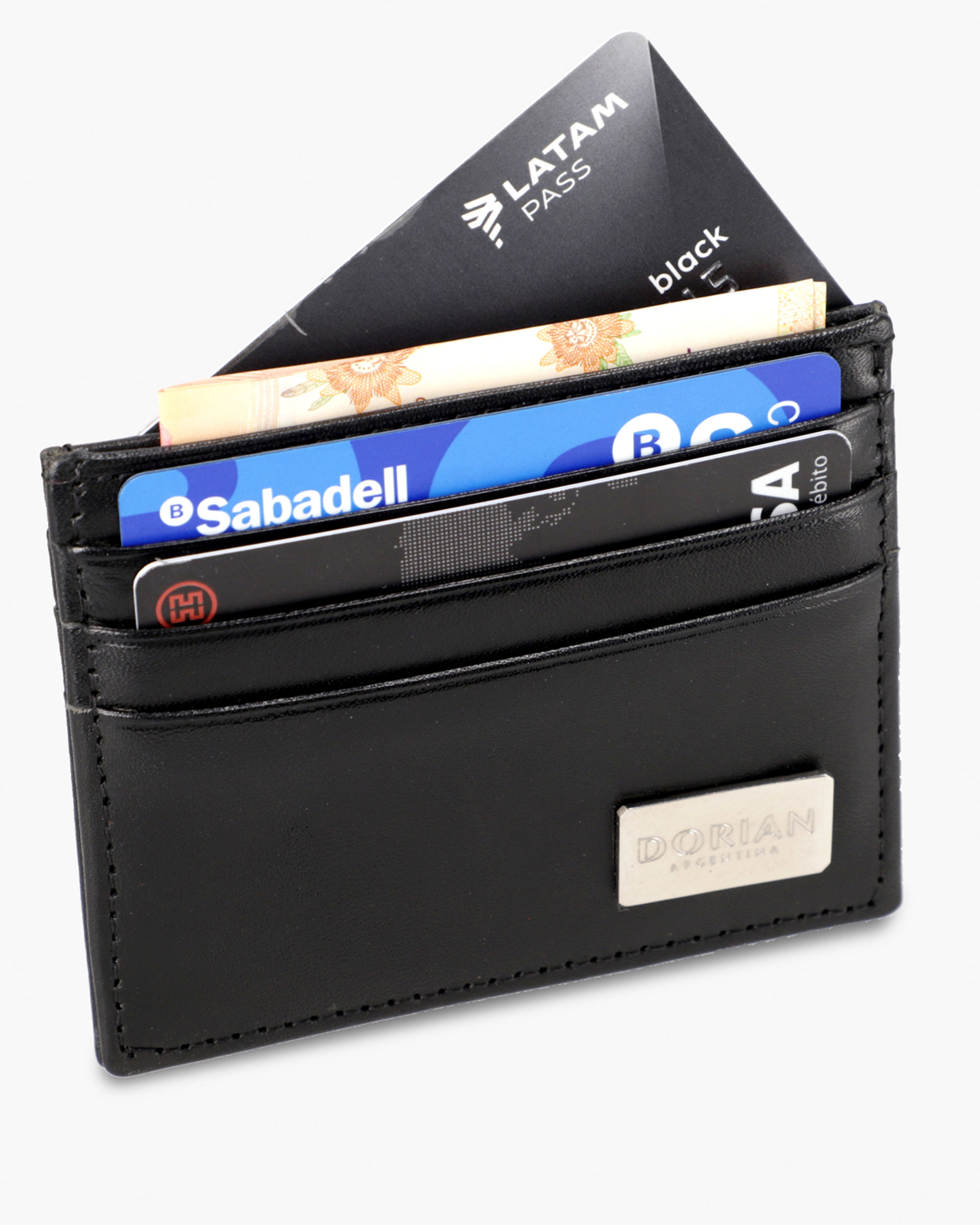 Leather card holder. Features 3 card slots. Compact size (10 × 8 cm). Metal appliqué with DORIAN logo.