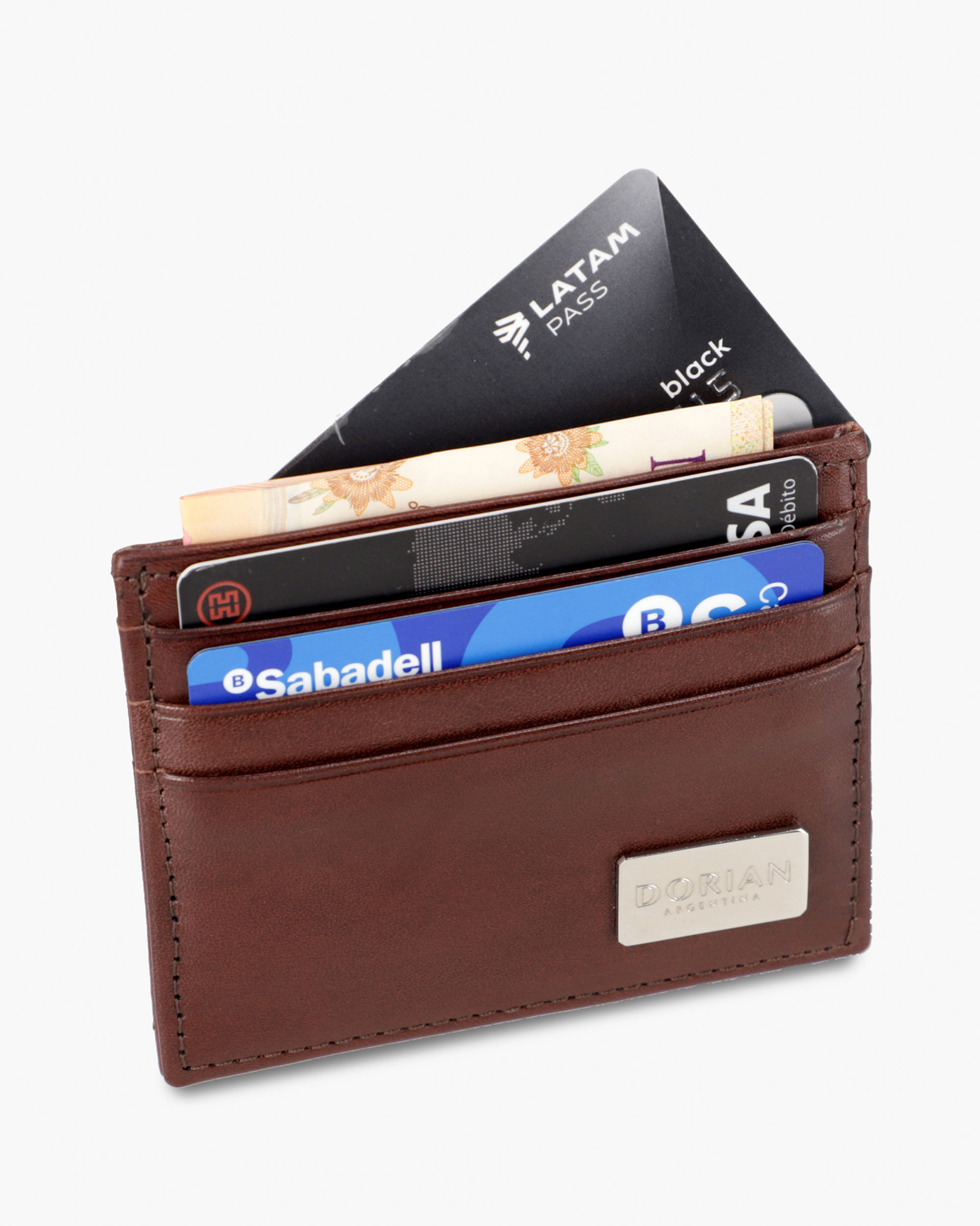 Leather card holder. Features 3 card slots. Compact size (10 × 8 cm). Metal appliqué with DORIAN logo.