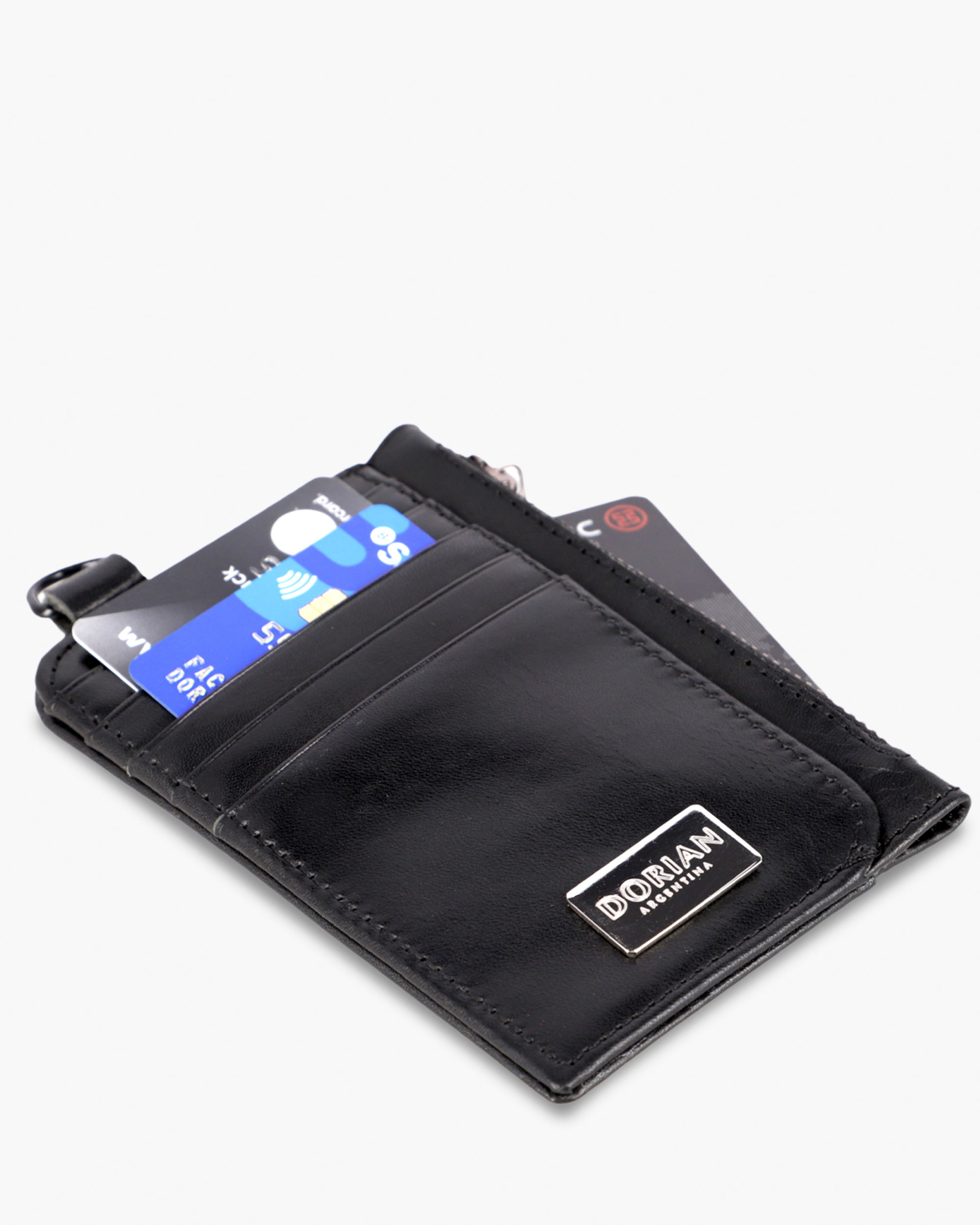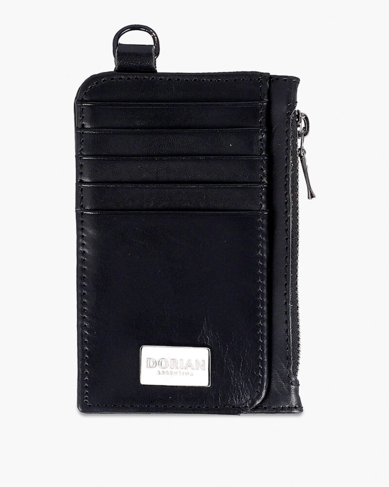 Card holder made of genuine black cowhide leather. Five flat card slots on each side, comfortably holding up to 10 cards. Main compartment with gusset and metal closure, ideal for bills, coins, or additional cards. Compact design. Dimensions: Height: 13 cm, Width: 8.5 cm. Metal DORIAN logo appliqué.